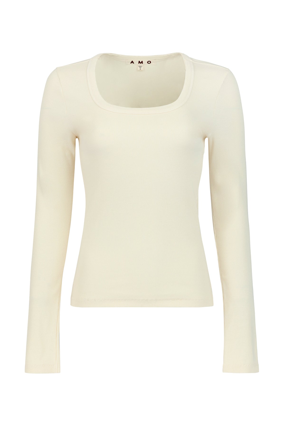The Angelina Long Sleeve from AMO is a mini rib long sleeve designed with a flattering scoop neckline and a close, body-hugging fit. Intentional distressing throughout adds a touch of lived-in edge to this timeless essential.