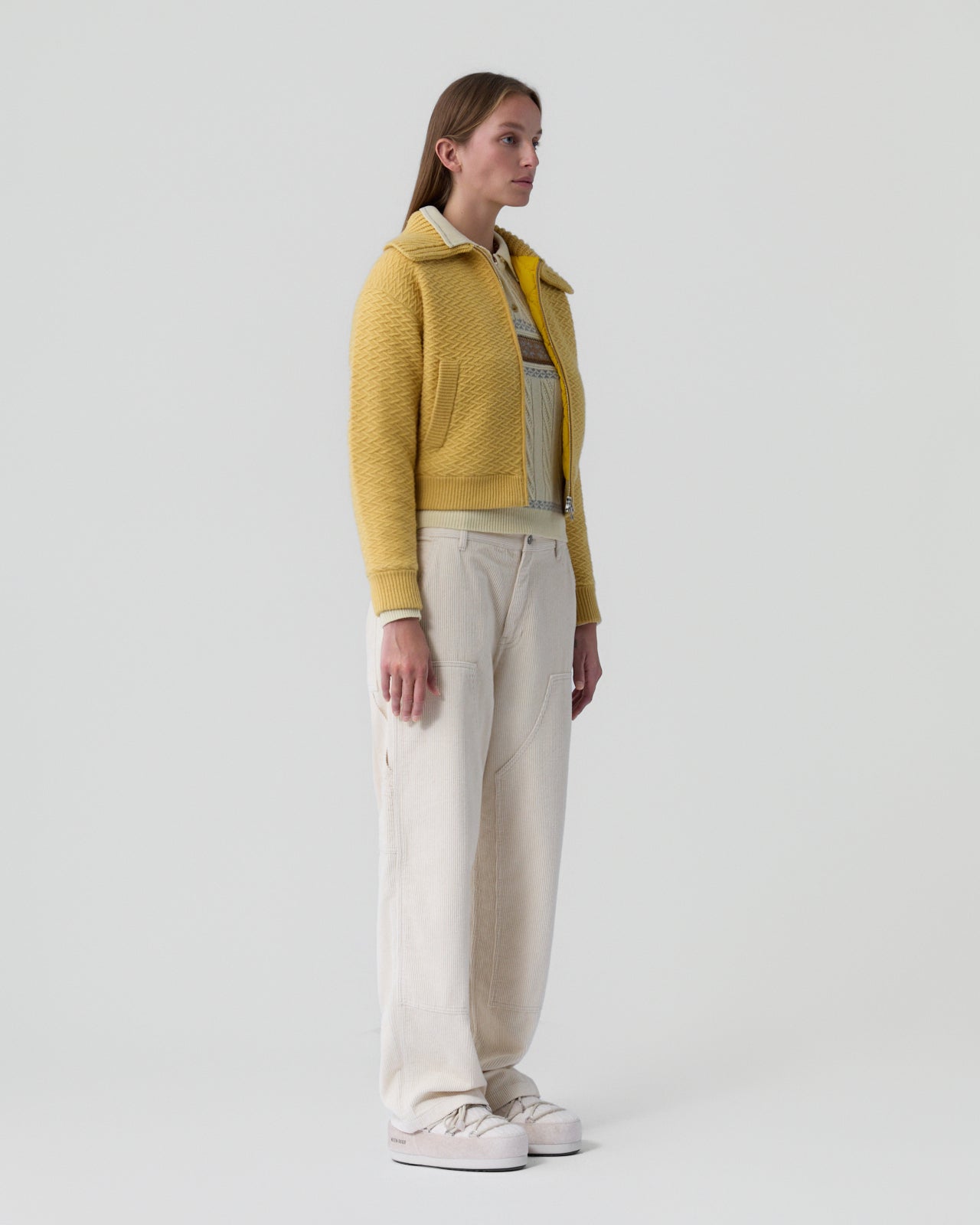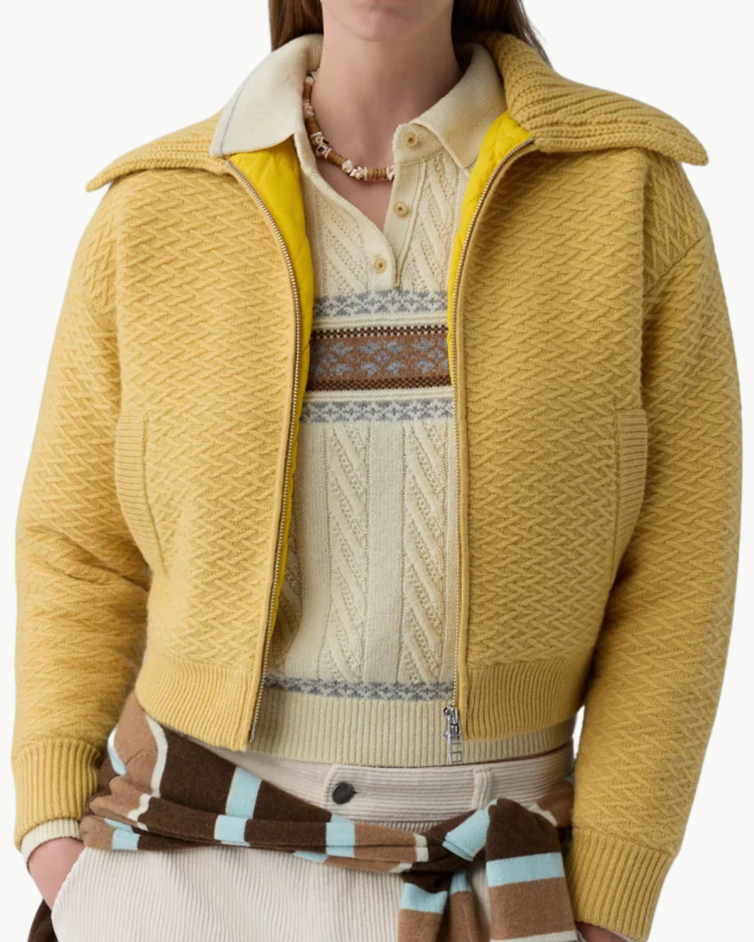 The Cross Country Bomber is a refined cold-weather layer that balances warmth, texture, and a sporty sensibility. Crafted from a heavy-weight wool–cashmere blend, this bomber features a chunky rib polo collar and an insulated quilted lining for cozy comfort. Polished details like a two-way zip closure and clean pocket placement elevate the silhouette, making it an effortless statement for everyday winter dressing.