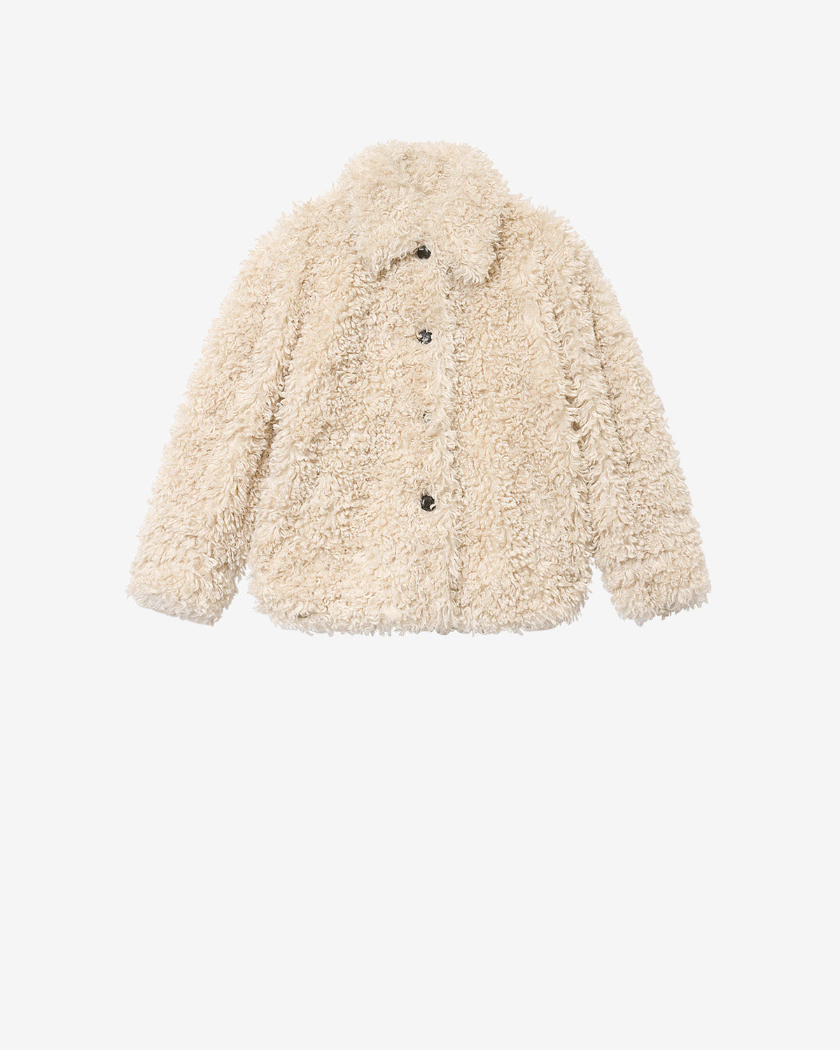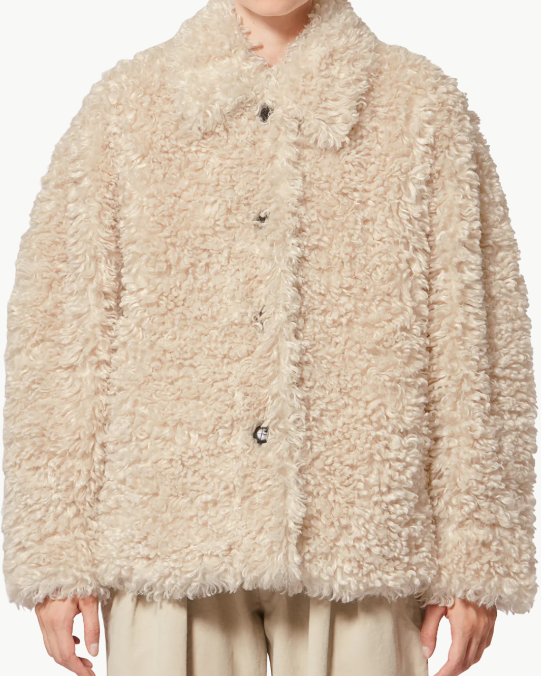 This short faux fur coat brings a soft, bouclé-inspired texture to a classic silhouette. Its plush finish, rounded buttons, and easy structure make it an effortless cool-weather piece with modern charm.
