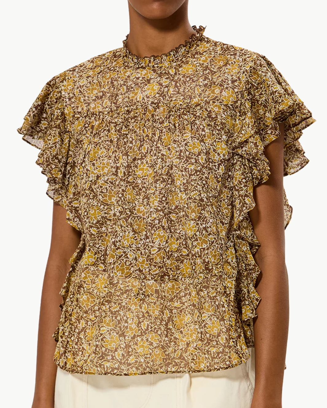 This airy cotton voile blouse brings a soft, feminine feel with its gathered detailing and effortless drape. The sleeveless silhouette and delicate pleating add subtle dimension, making it an easy, polished piece for warm-weather styling.