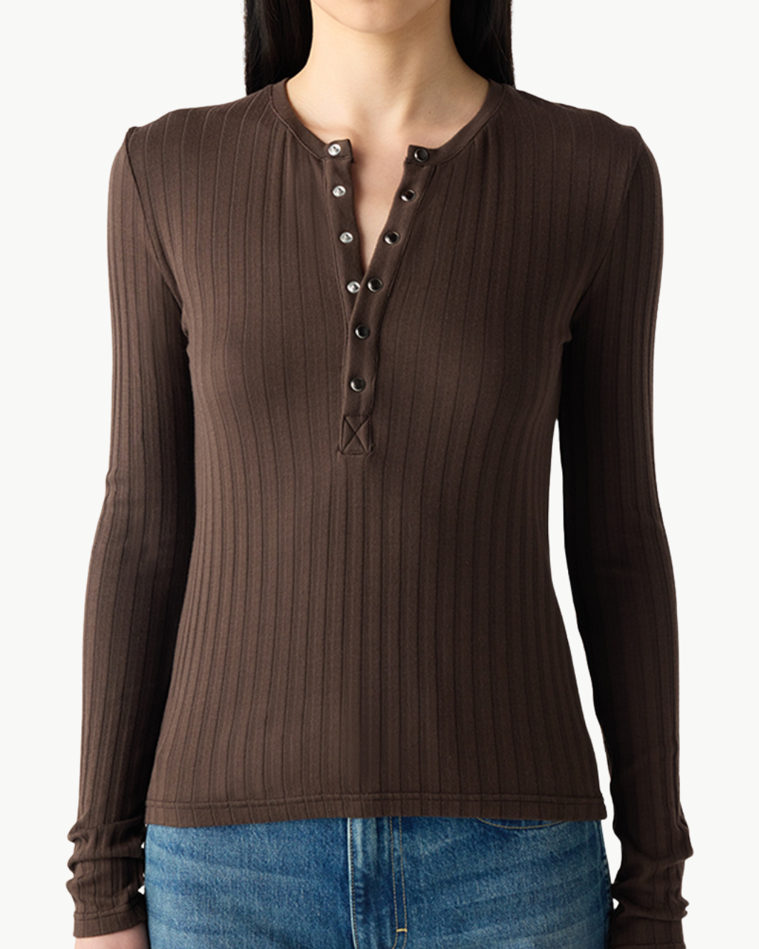 The Lottie Top in Mocha is a versatile cotton-blend ribbed henley, crafted for effortless layering or standalone wear. Featuring long sleeves and a snap-front placket with mother-of-pearl effect snaps, this top balances casual comfort with refined detail.