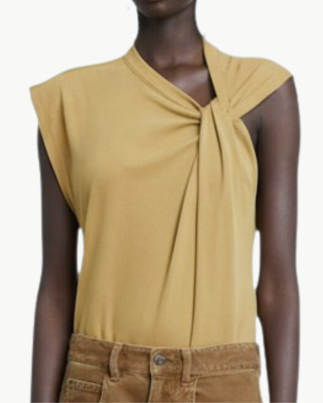 The Nayda T-Shirt brings a modern twist to everyday dressing with its asymmetrical silhouette and softly structured cotton feel. Designed in a muted dusky yellow, it features a twisted neckline, loose armholes, and ribbed finishes that add subtle texture. A rounded hem and relaxed fit create an effortless drape, while a tone-on-tone embroidered Isabel Marant logo completes the understated look.