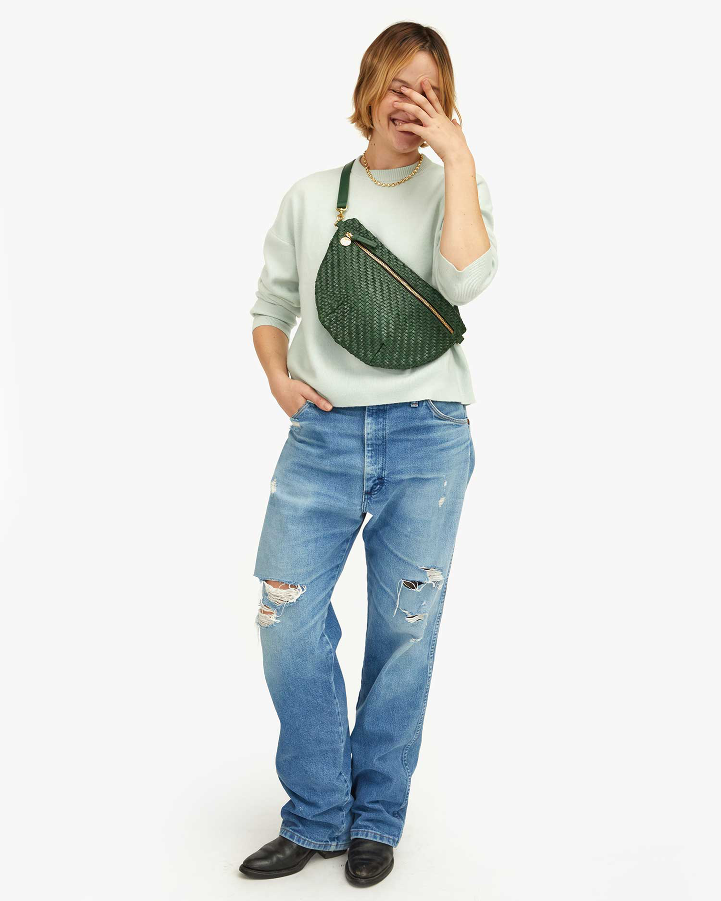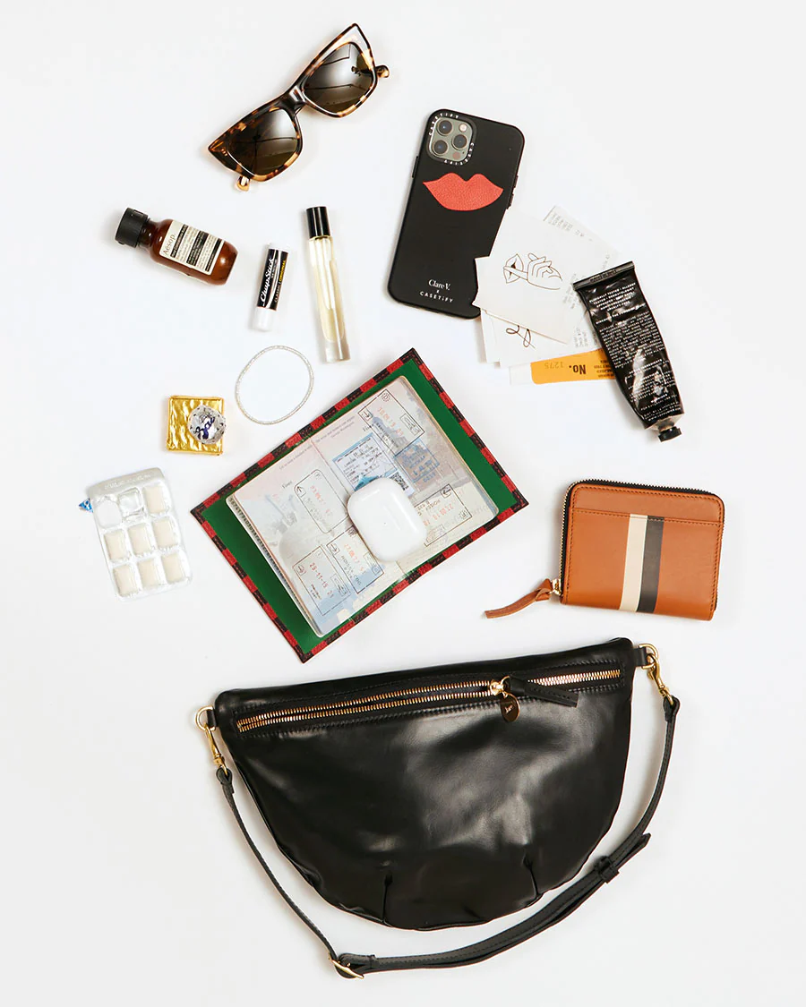 This Clare V. Fanny Bag in green is the ultimate accessory for effortless style and functionality. Crafted from handwoven leather, it combines premium quality with a sleek, modern design. The adjustable and detachable strap allows you to wear it as a shoulder bag or customize the fit to your preference, offering versatile styling options. Lined in chambray for a soft, refined finish and featuring a bold black zipper, this bag is perfect for those who love both style and practicality. Its minimalist design keeps things simple yet chic, making it your new favorite on-the-go accessory.