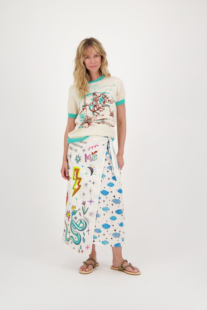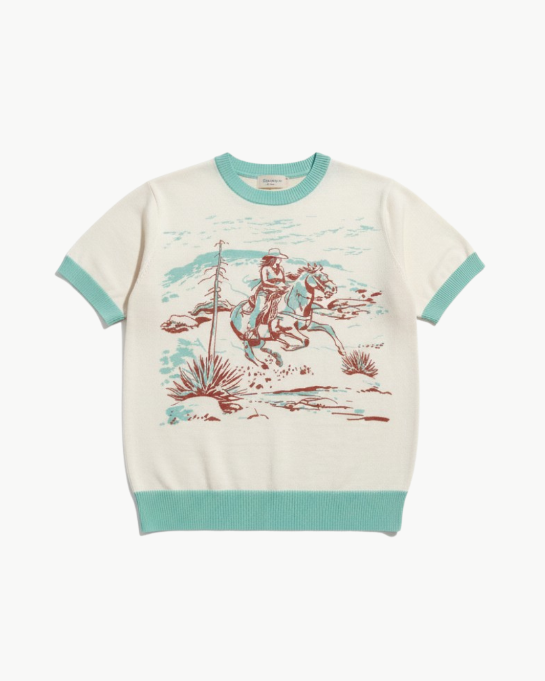 The Nora Knit Top in Desert Ride from ME369 captures the spirit of adventure with its bold graphic design featuring a majestic horse in a desert landscape. Made from 100% cotton, this crew neck t-shirt offers both comfort and style, perfect for casual days when you want to showcase your love for nature and animals.