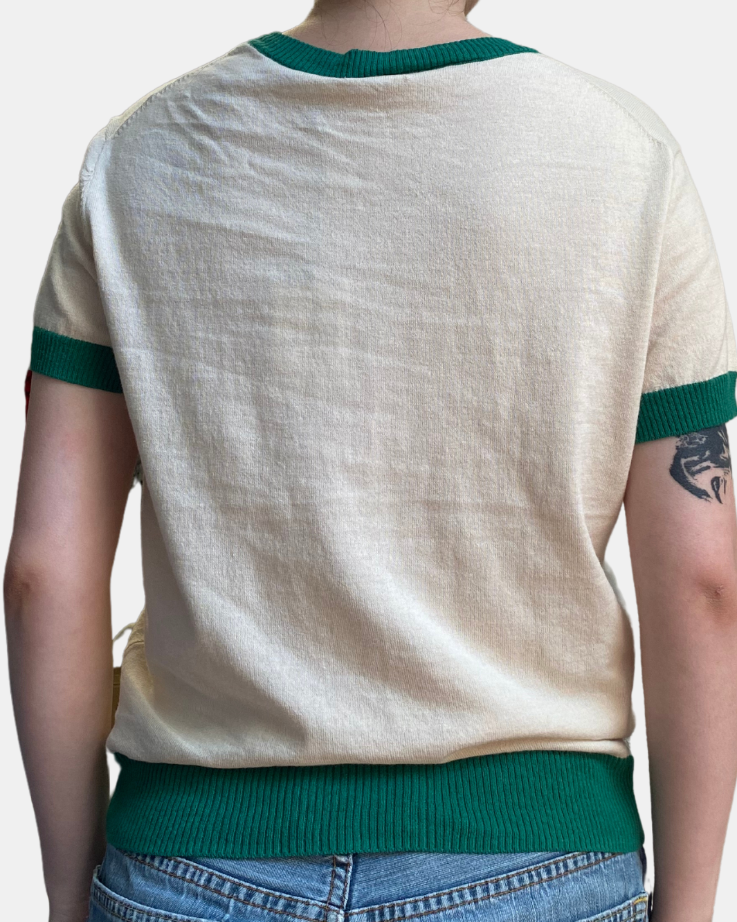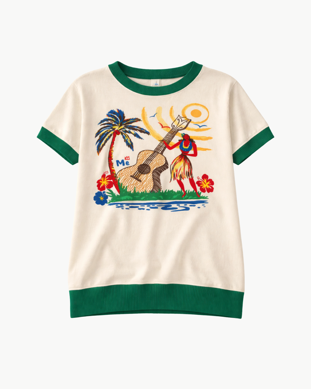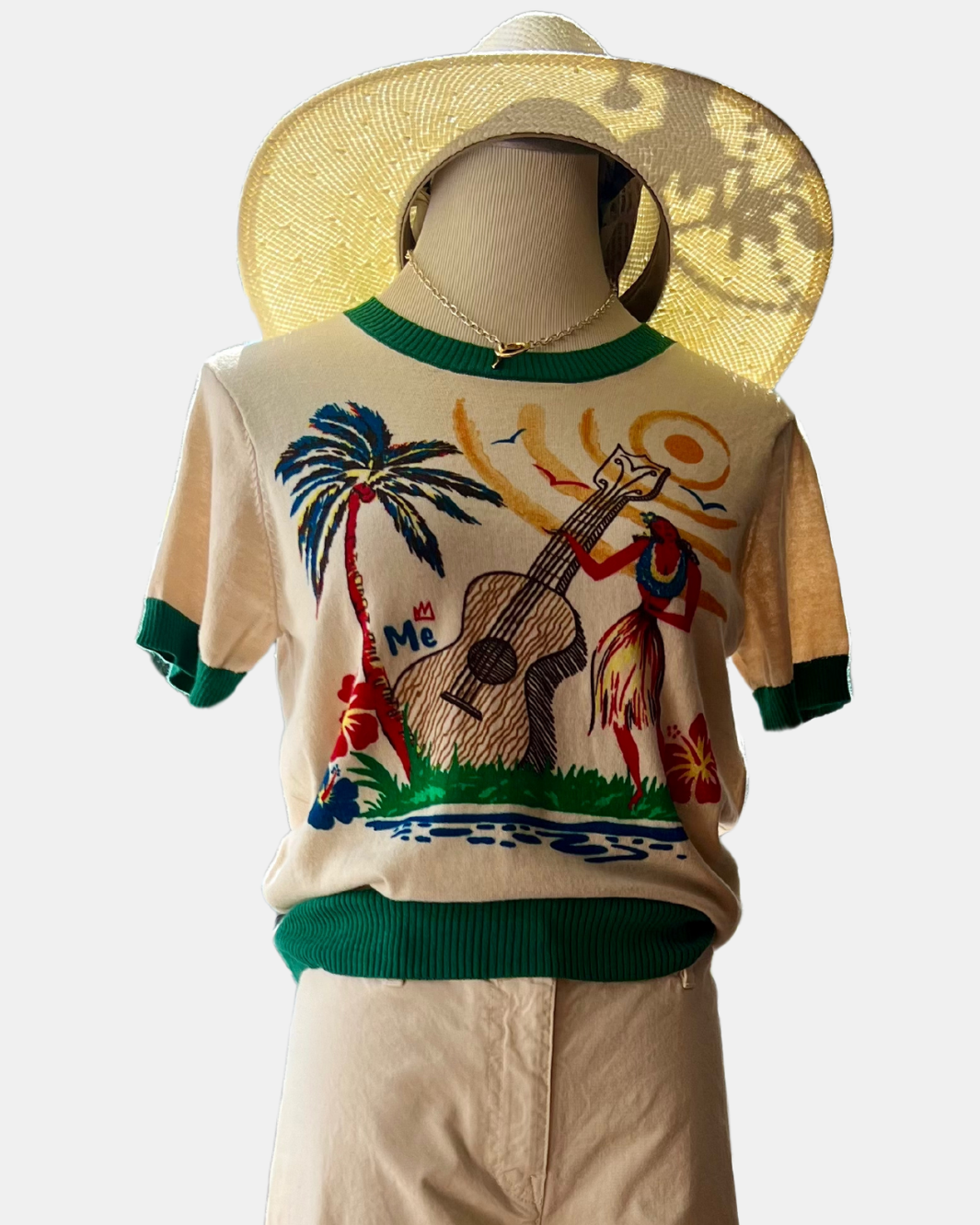 The Nora Knit Top in Guitar is a fun and vibrant graphic t-shirt that effortlessly combines music and tropical vibes. Featuring a striking guitar and Hawaiian graphic, this crew neck top adds a playful yet stylish touch to your casual wardrobe. Made from soft 100% cotton, it offers comfort and breathability, making it perfect for warm weather or laid-back days.