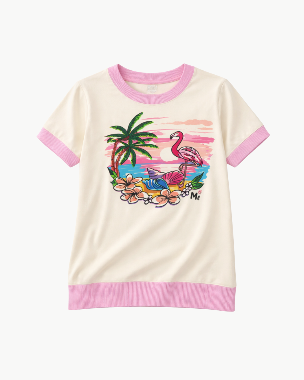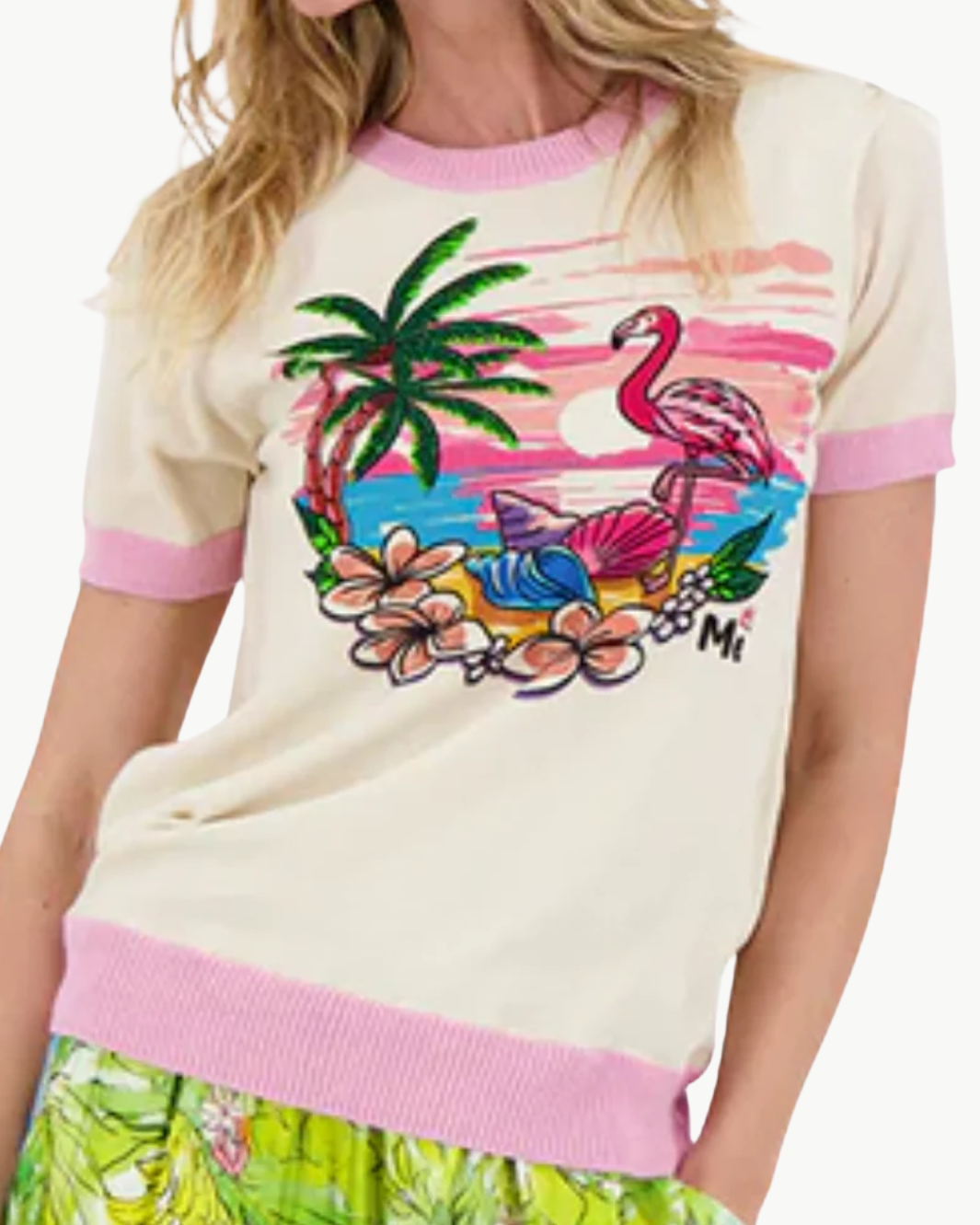 The Nora Knit Top in Sunset from ME369 is a vibrant, tropical-inspired graphic tee perfect for adding a fun, relaxed vibe to your wardrobe. The shirt features a stunning sunset scene with palm trees, flowers, and a flamingo, all framed by playful pink edges. Made from 100% cotton, this short-sleeve pullover ensures comfort while making a statement.