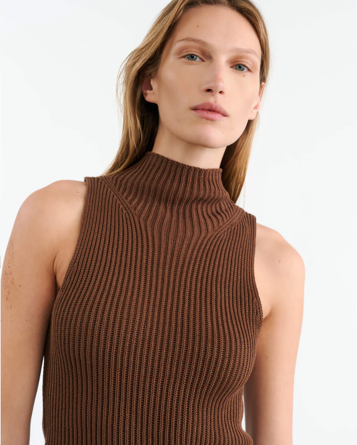 Luxurious sleeveless turtleneck sweater frmo Nili Lotan crafted from the finest Italian cotton. The ribbed texture adds a touch of sophistication, while the premium cotton provides exceptional comfort and breathability. Meticulously fully fashioned at the armhole and shoulder for a flawless fit and drape. A versatile piece perfect for layering or wearing on its own.