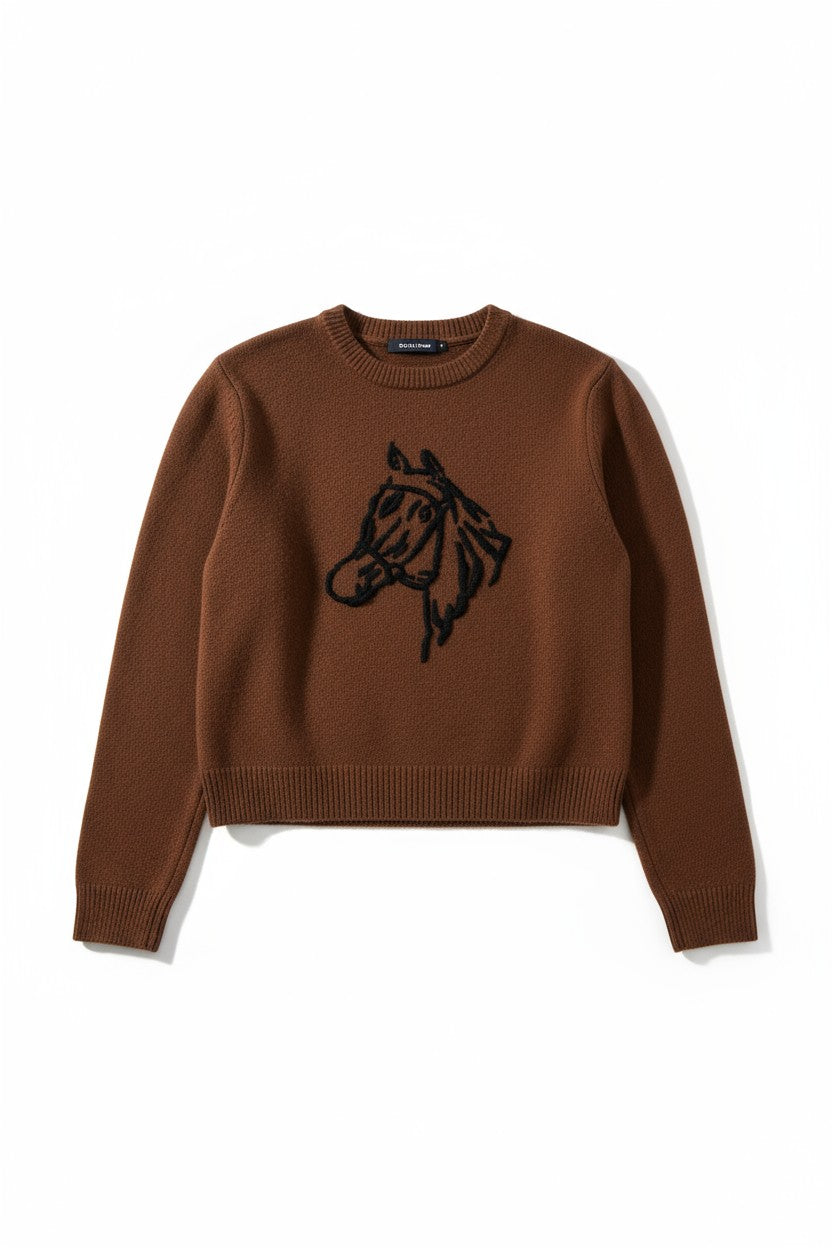 Cozy up in this charming crewneck sweater featuring a playful horse embroidery that adds a subtle, whimsical touch. Crafted from a soft cashmere–wool blend, it delivers warmth, comfort, and a luxurious feel—perfect for casual days when you want to stay stylish and snug.