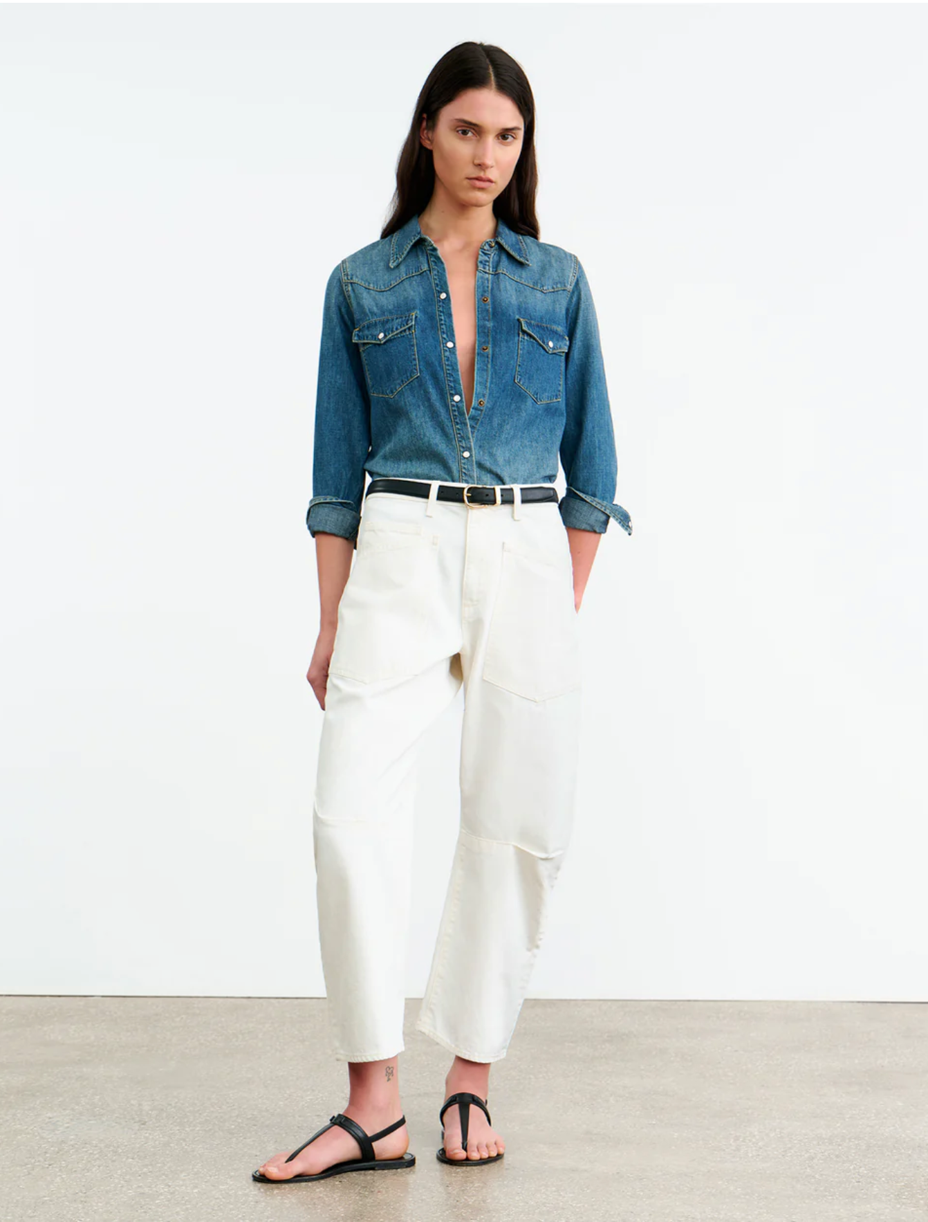 The Shon Jean in Cream delivers a modern twist on denim with its distinctive barrel-leg silhouette and curved seams. Crafted in Japanese stretch denim, this mid-rise, relaxed fit style is finished with thoughtful construction details and a cropped 26" inseam—perfect for showcasing your footwear.