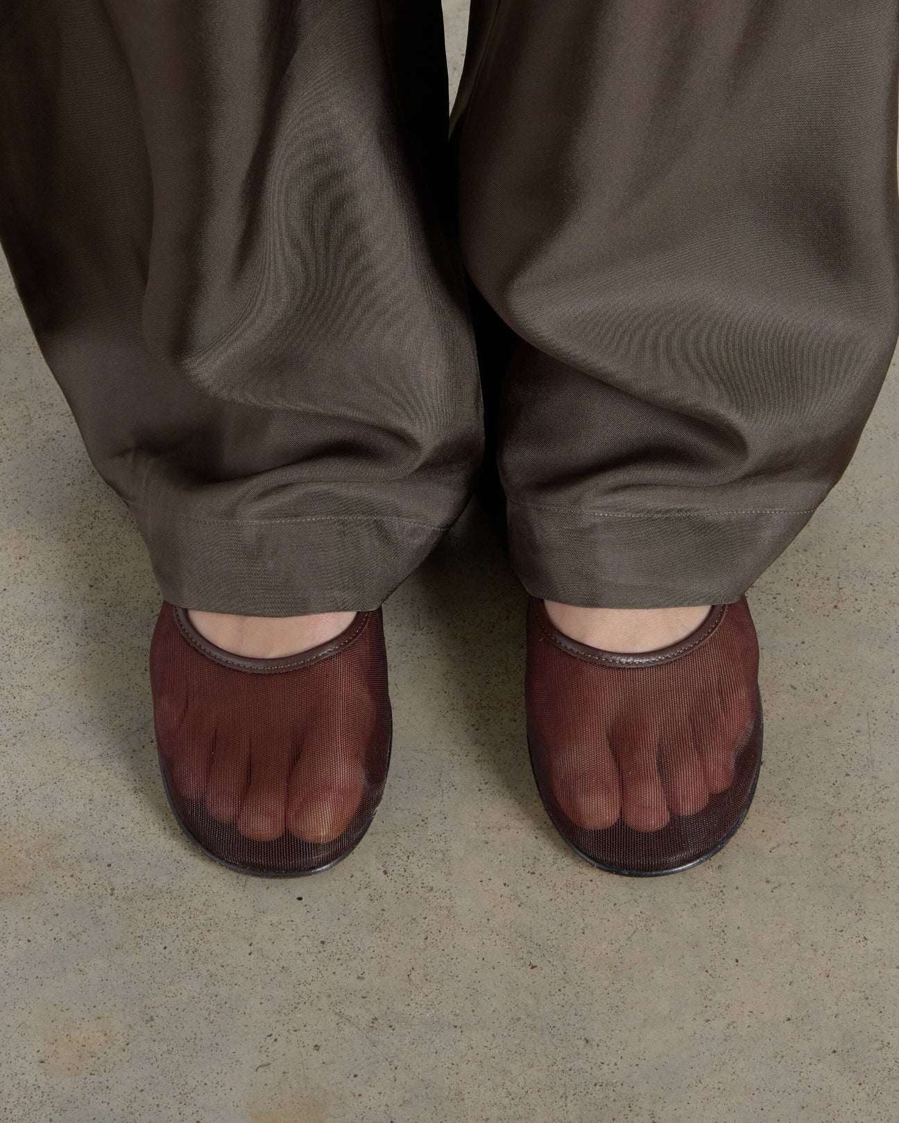 A modern ballet flat with understated elegance. The Balla Mesh is crafted in sheer Italian mesh in a rich coffee hue, finished with soft leather edges for subtle structure. A leather-wrapped, padded insole and buffed leather outsole ensure lasting comfort, while the flat stacked cuoio heel completes this versatile silhouette.
