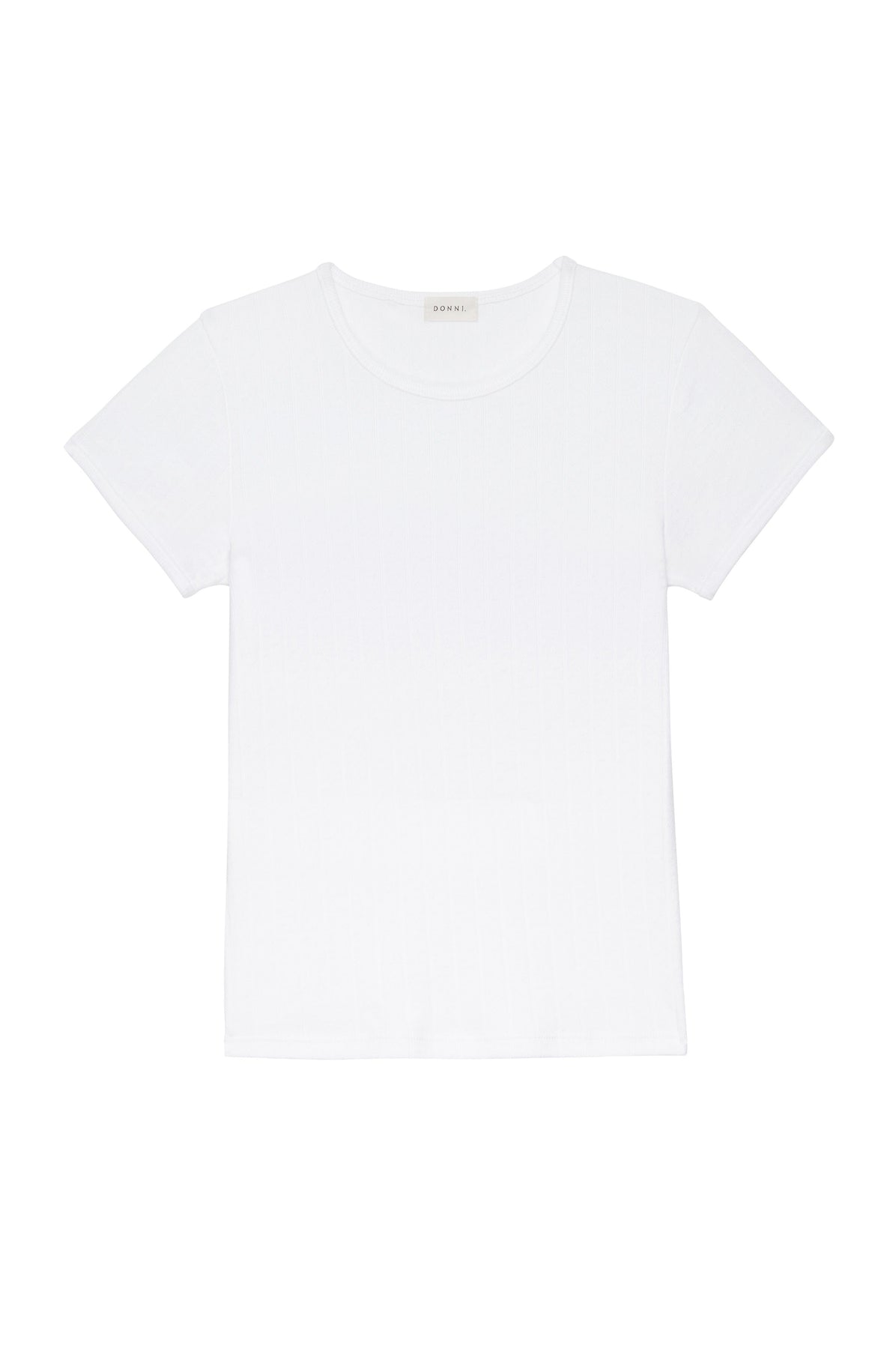 The Pointelle Baby Tee is a timeless essential crafted from lightweight 100% organic cotton. Designed with a classic crew neckline, delicate pointelle knit, and cap sleeves, it skims the body for a flattering, feminine fit—easy to wear in every season.