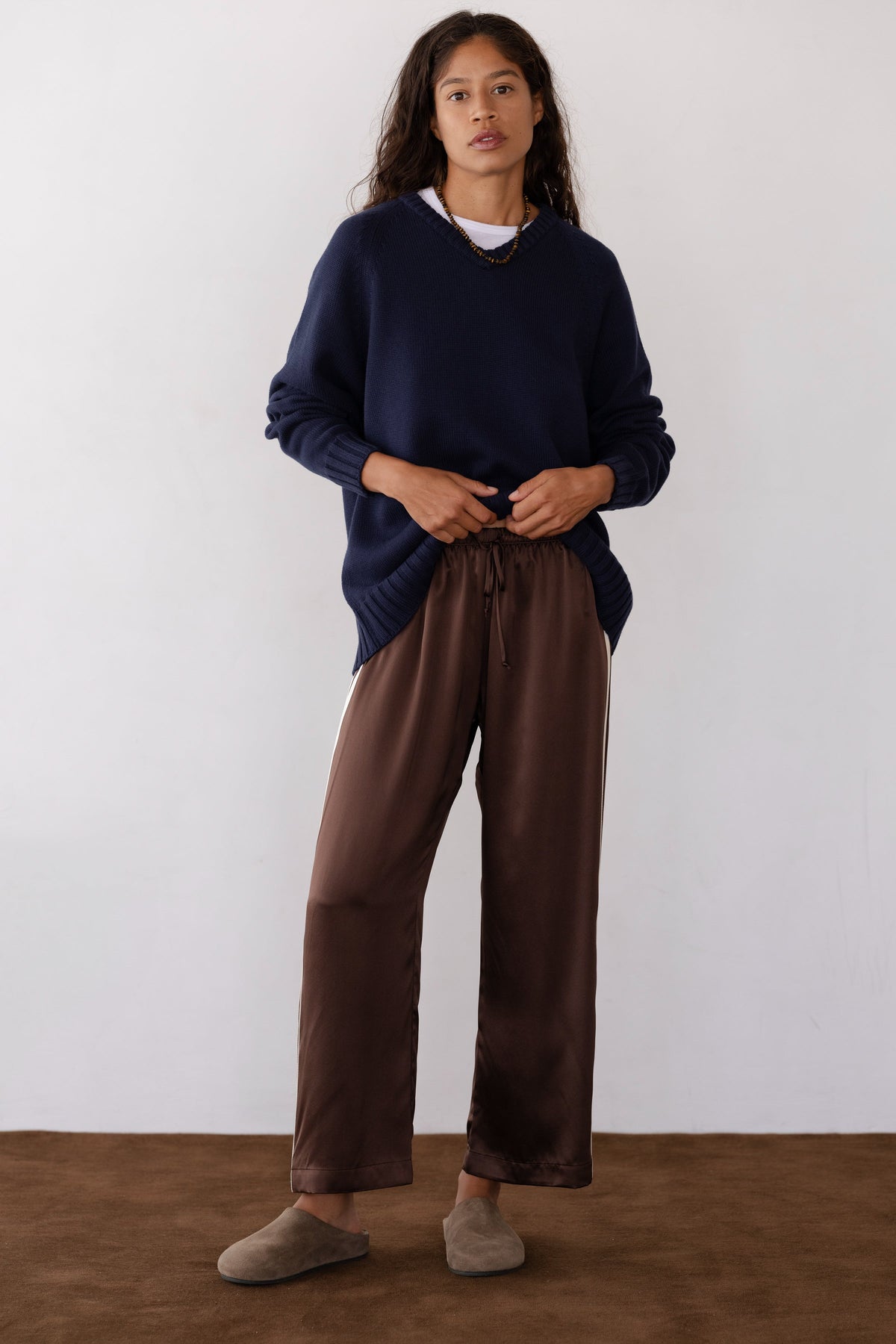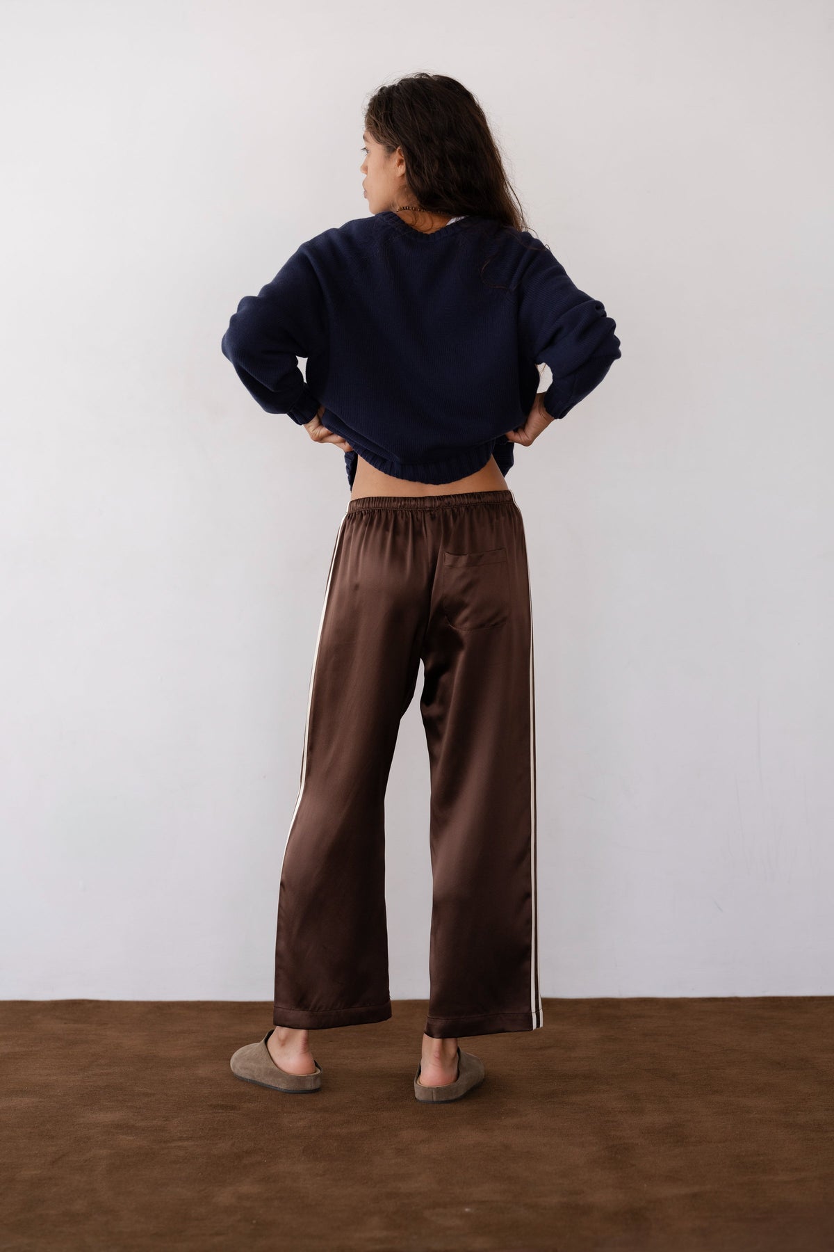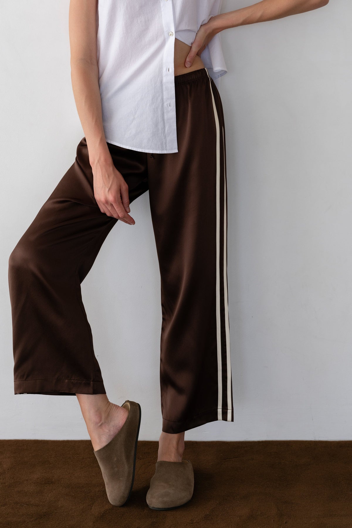 Effortlessly chic, the Silk Stripe Crop Pant blends relaxed comfort with elevated style. Its fluid drape and cropped silhouette give a modern edge, while the racer stripes and drawstring waist add sporty sophistication to luxurious silk charmeuse.