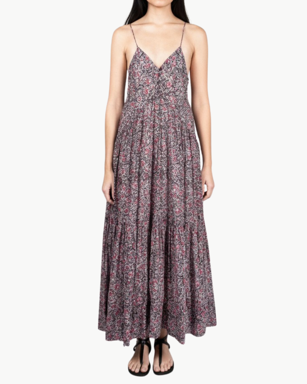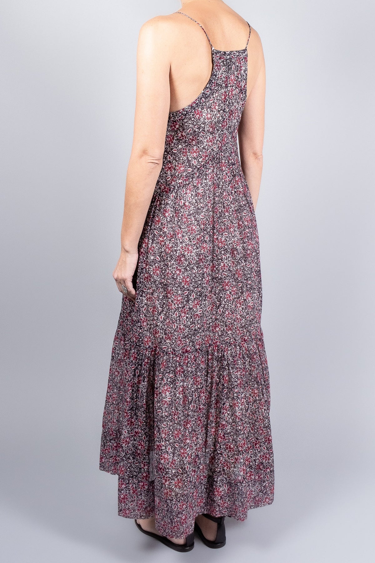 This printed cotton voile dress offers an airy, graceful flow with its long flared silhouette and delicate straps. Light gathers and thoughtful seams enhance its movement, giving it an effortless, feminine feel perfect for warm-weather dressing.