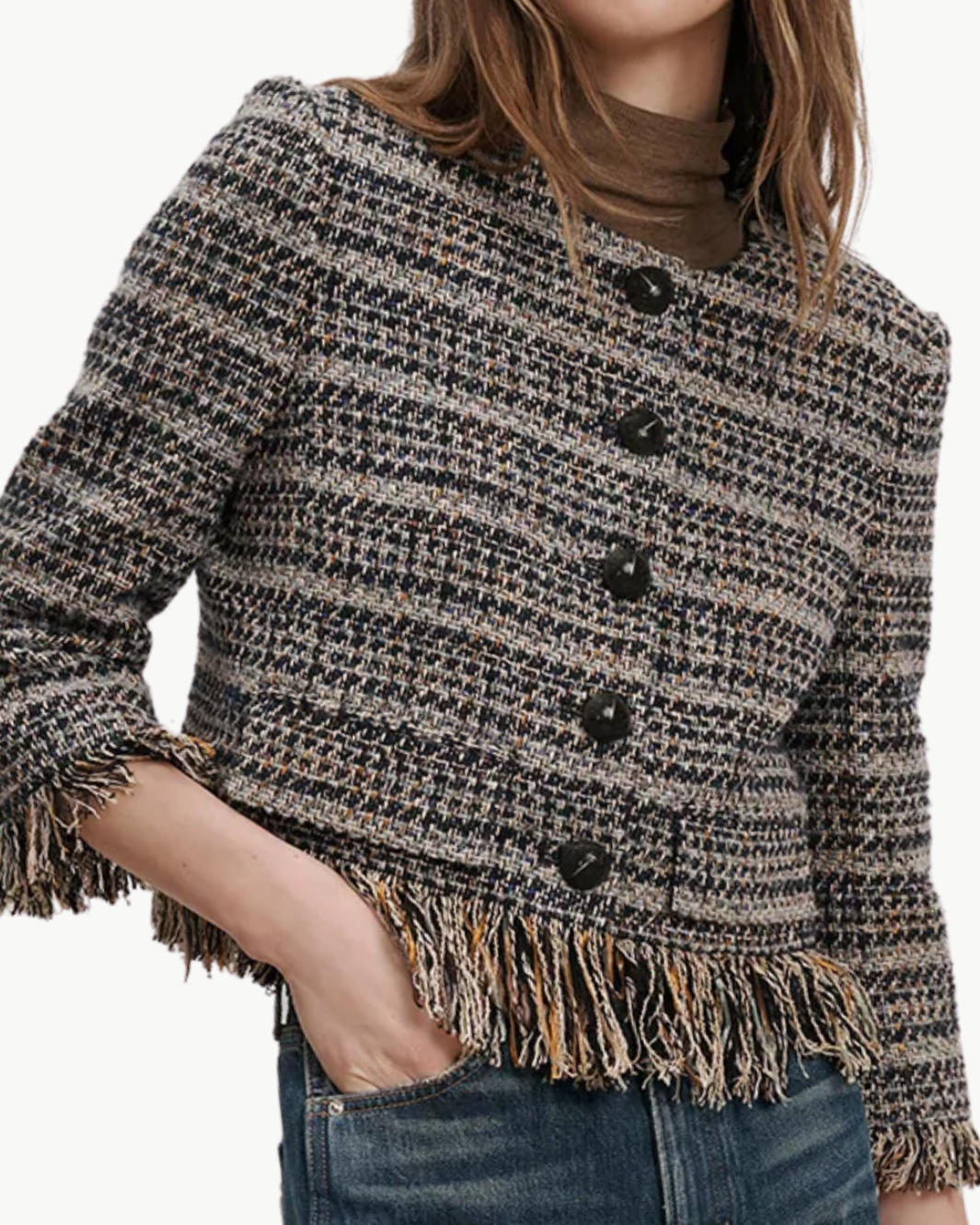 The classic lady jacket takes on a fresh bohemian spirit in the Lyons, crafted from premium Italian tweed. Designed with a collarless, cropped silhouette and a boxy fit, this piece is elevated by multicolored fringe trimming the hem and sleeves for a playful edge. Three-quarter sleeves and flap pockets add to its polished yet relaxed appeal. Wear it buttoned up for a chic, statement-making top or layered over a knit for effortless sophistication.