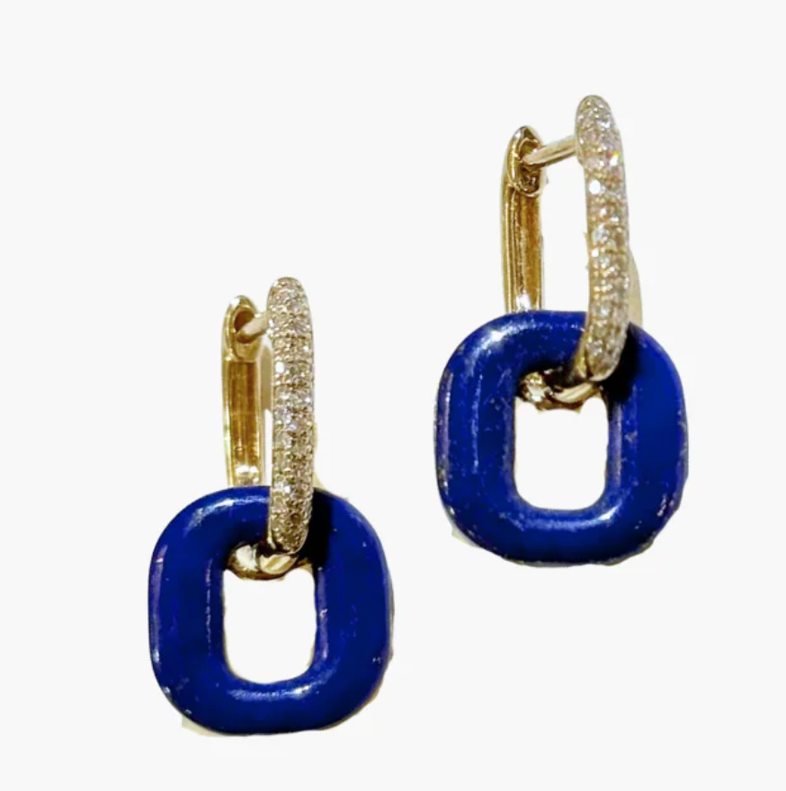 The Door Knob Earring is a refined statement piece that blends sculptural design with fine-jewelry craftsmanship. Designed with a polished lapis drop suspended from a delicate hinged hoop, this style delivers a bold yet elevated look that feels modern, collectible, and timeless.