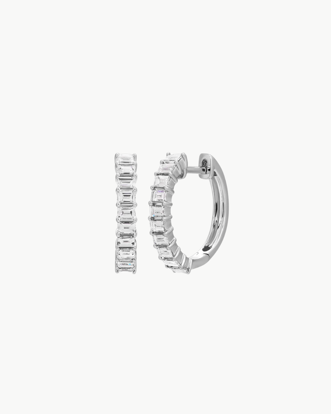 The Prong Set Diamond Baguette Hoop Earrings bring timeless sophistication with a touch of glamour. As the elevated sister to the Baguette Huggie, these hoops feature ten sparkling diamonds set along the front of each earring, offering just the right amount of brilliance for everyday wear or special occasions.