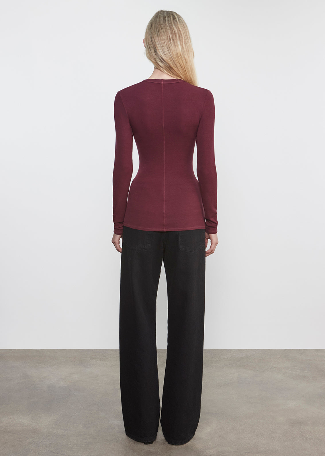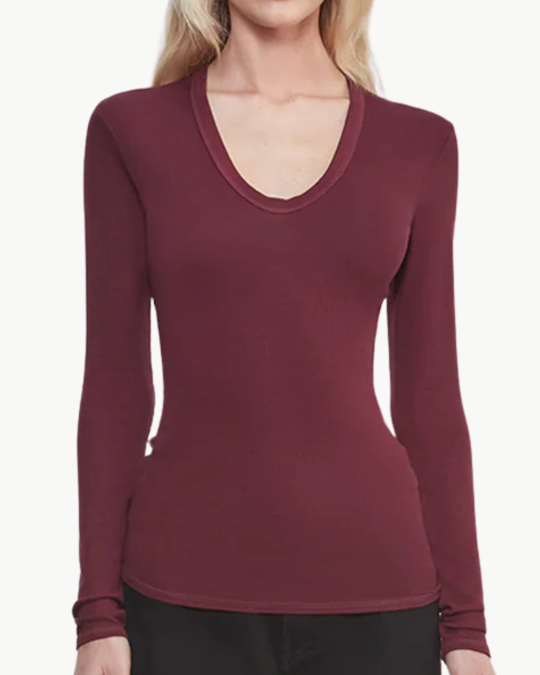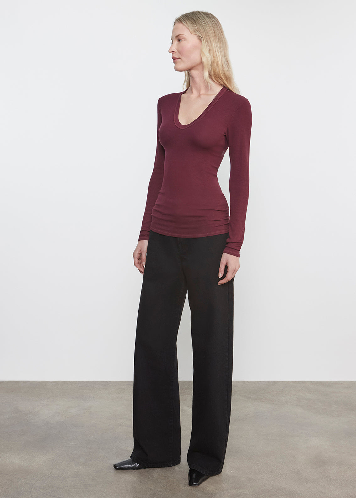 Slim long-sleeved U-neck crafted in Enza Costa’s best-selling silk rib fabric. Designed with a refined, body-skimming silhouette that feels soft and luxurious against the skin. Perfect on its own or as an elegant layering essential.