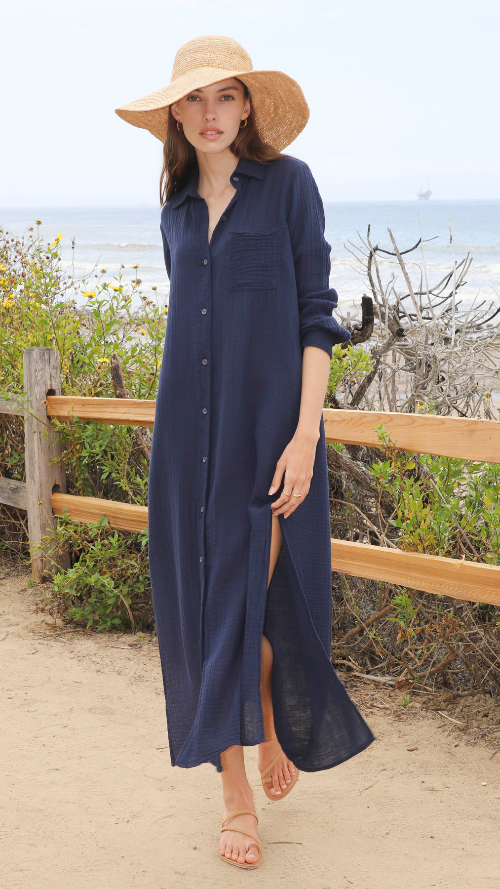 BOYFRIEND MAXI DRESS GAUZE IN NAVY - Romi Boutique
