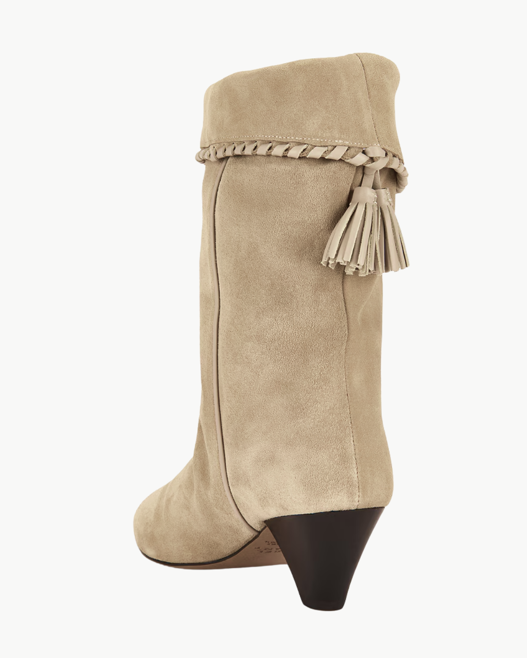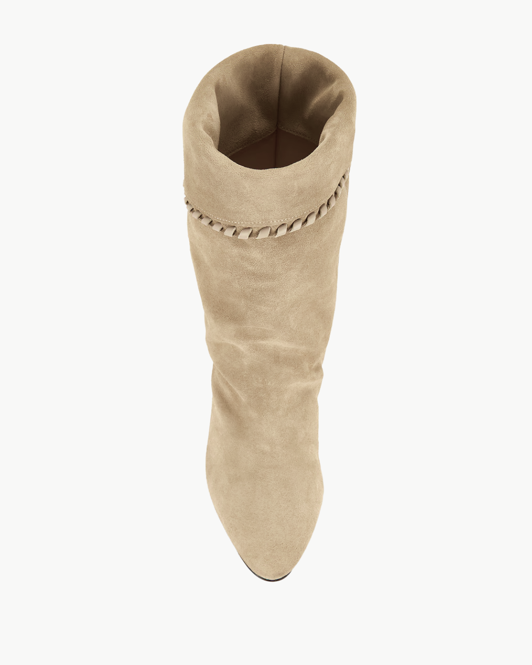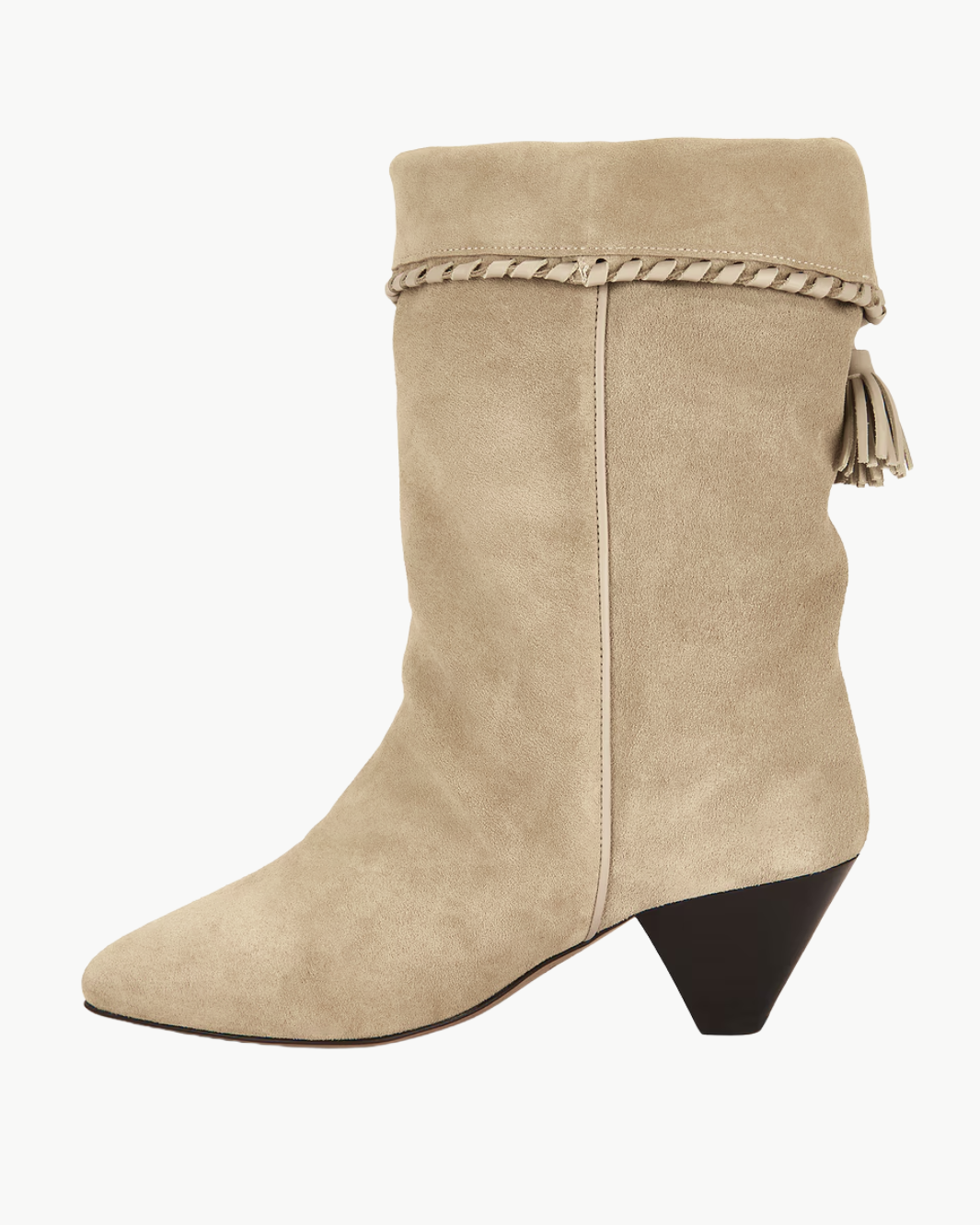 These calfskin boots capture a soft, sculptural attitude with their turn-down suede uppers and braided leather detailing. Finished with tassels and a sleek cone heel, they bring effortless sophistication to winter dressing.