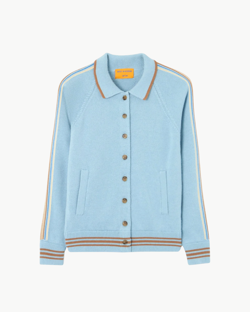 The Varsity Jacket brings a sport-inspired edge to everyday knitwear. Crafted from a soft cotton–cashmere blend, this mid-weight jacket features classic varsity details including athletic stripe accents and ribbed trim. Designed with a relaxed raglan sleeve silhouette and front button closure, it offers an easy balance of comfort and polished casual style.