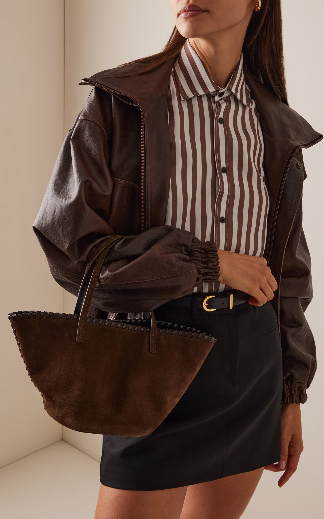 The Caro Suede Bucket Bag brings an artisanal, basket-inspired feel to everyday accessories. Crafted from supple suede and finished with contrasting leather whipstitching, this open-top silhouette balances relaxed structure with refined detail—an effortless piece that elevates both casual and dressed looks.