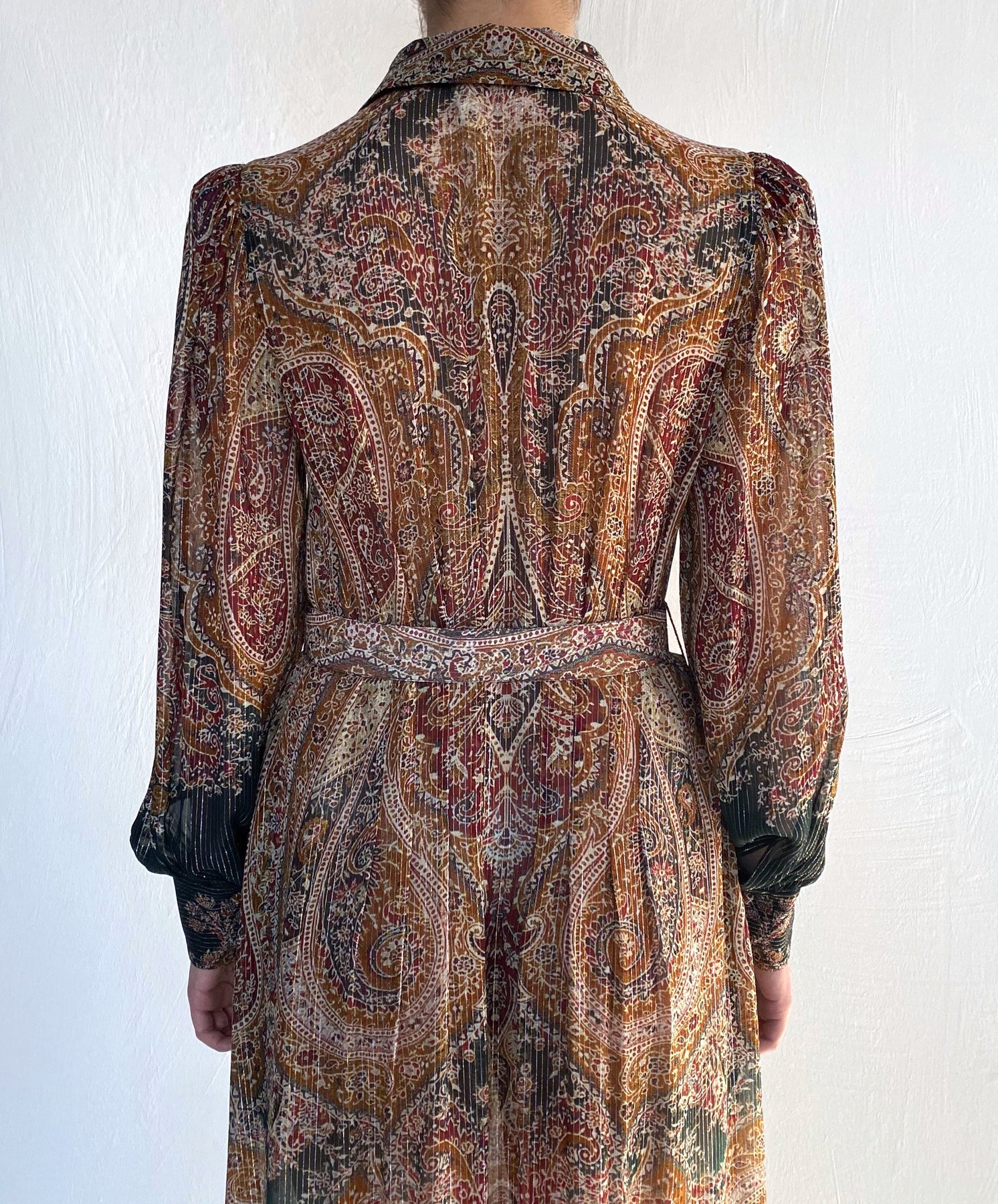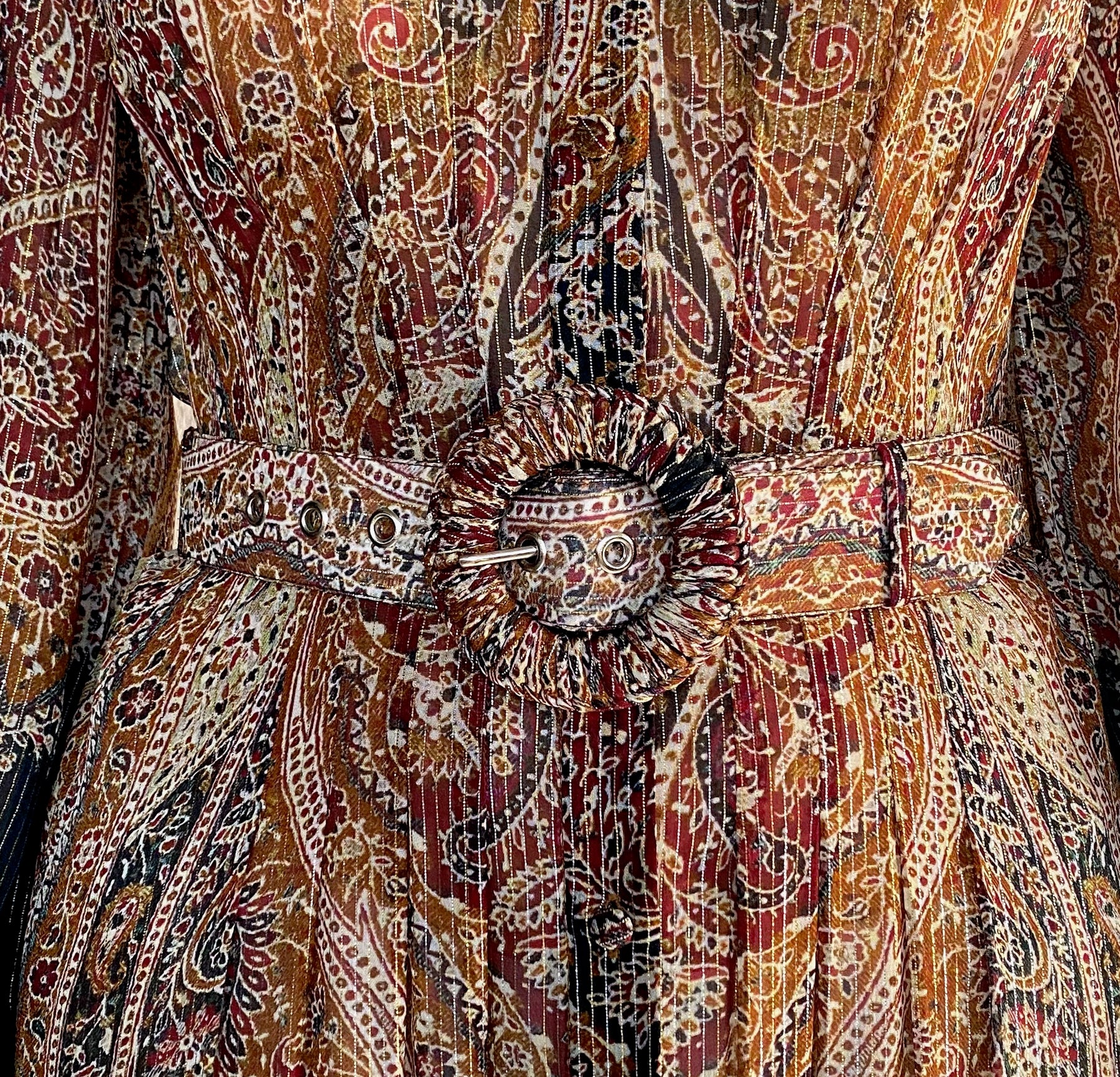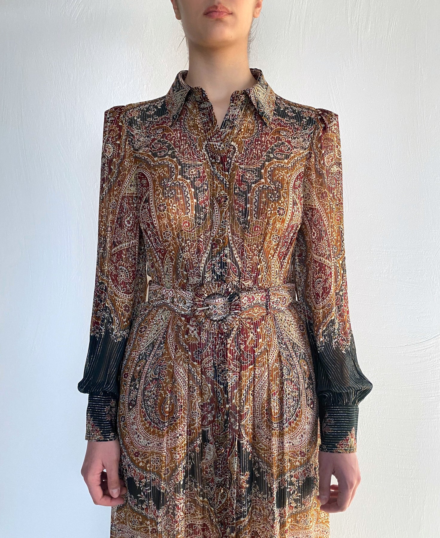 Effortlessly striking, the Ruza dress blends a timeless shirtdress silhouette with intricate printwork and subtle metallic accents. Flowing with ease and cinched at the waist, it’s a versatile maxi that transitions seamlessly from day to evening.