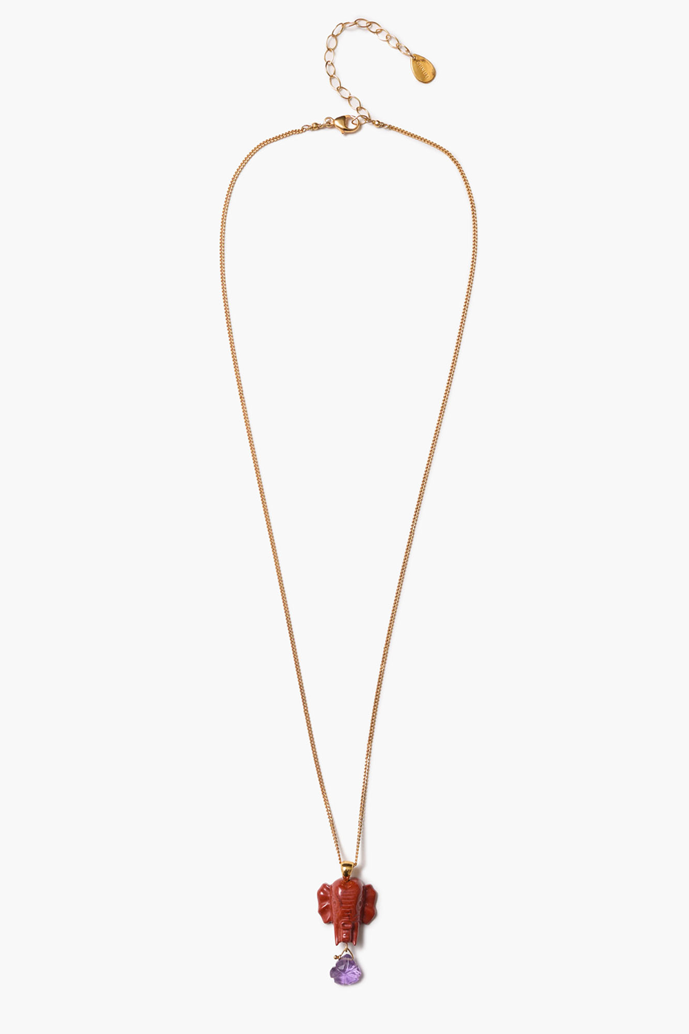 A meaningful accent with artisanal charm, the Elephant Necklace pairs symbolism with refined detail. A hand-carved red jasper elephant charm anchors the delicate gold chain, finished with a subtle amethyst drop that adds depth and contrast. Thoughtfully crafted and rich in texture, this necklace brings a sense of intention and individuality to everyday styling while remaining easy to layer or wear on its own.