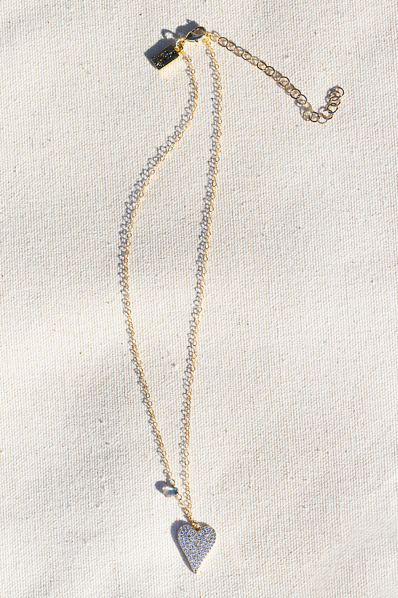 Sweet, simple, and effortlessly chic, the Glimmer Heart Necklace in Gold is a timeless piece designed to be worn every day and cherished for years to come. Featuring a sparkling heart accented with a tiny labradorite detail, this necklace strikes the perfect balance between delicate charm and subtle shine. The mid-length silhouette makes it ideal for layering or wearing solo, adding a soft glow and romantic touch to any look—from casual tees to elevated evening wear. Crafted from high-quality 14K goldfill, this necklace is made to last and designed for real life. Finished with a protective clear coat, it’s lead-free and cadmium-free, offering durability without sacrificing beauty. Thoughtfully designed to move with you, it’s a piece you’ll reach for again and again.