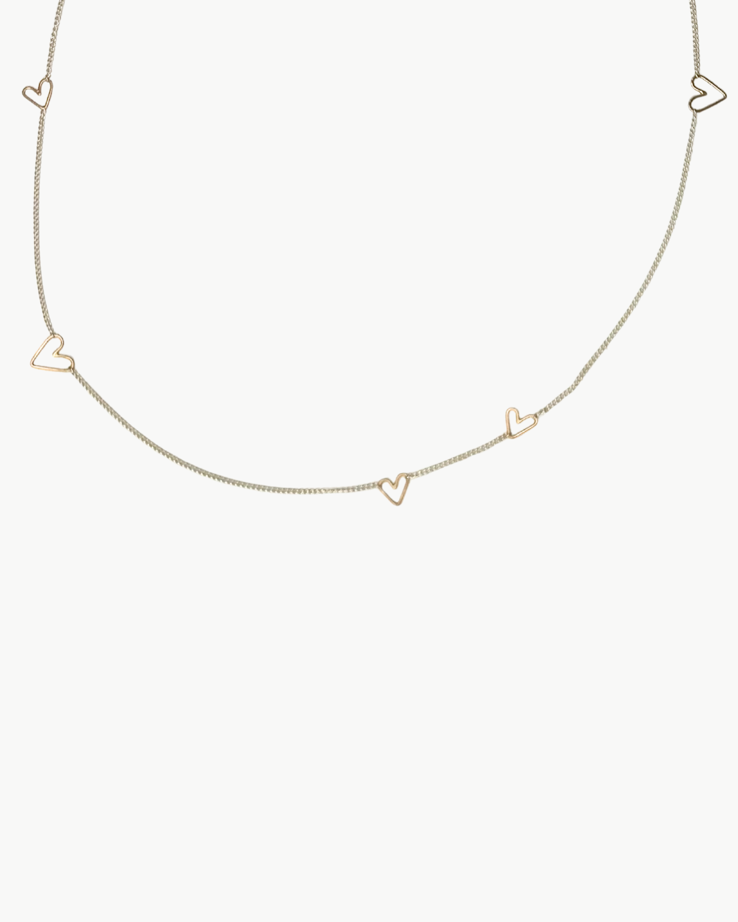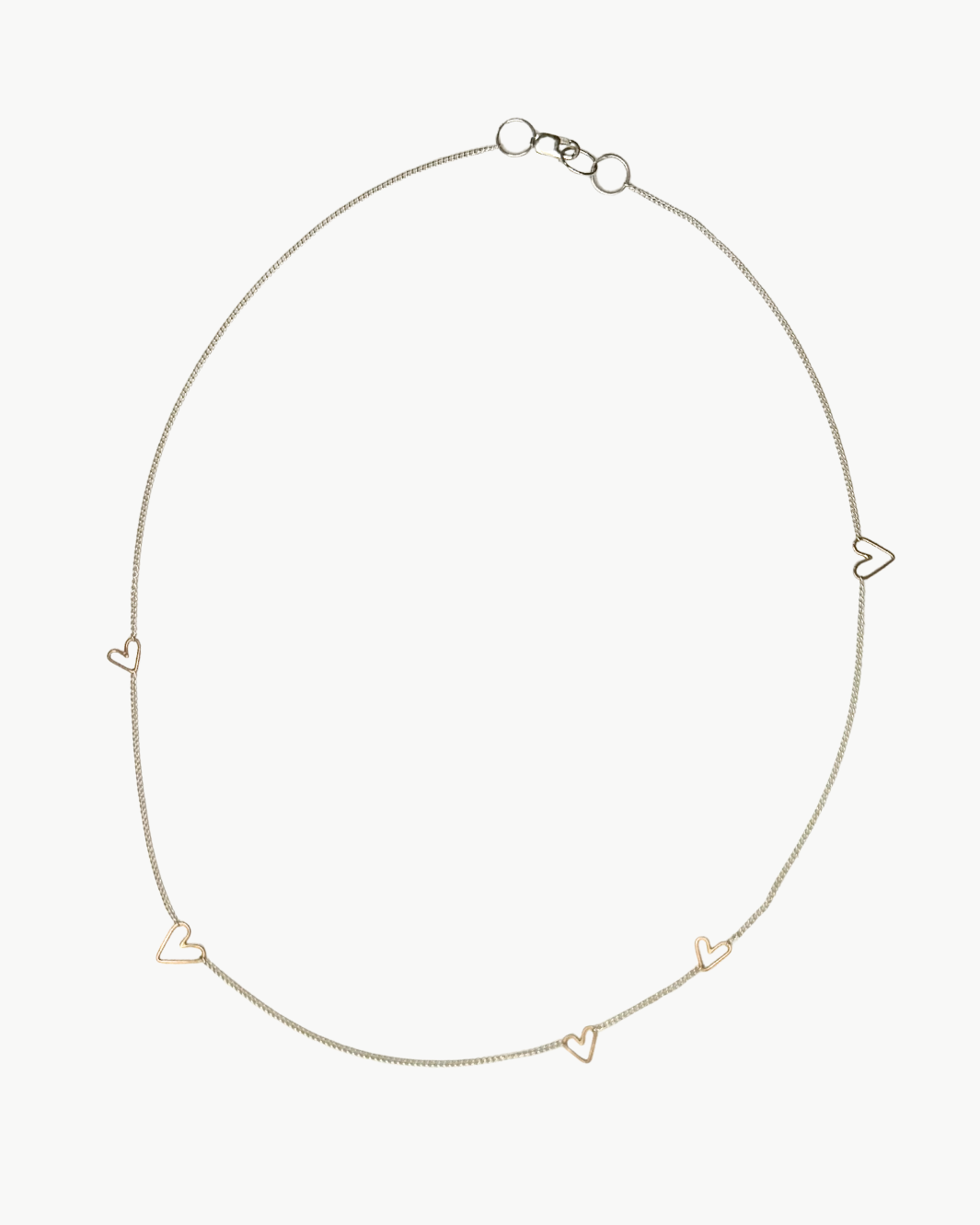 Delicate with a modern twist, the Honey 5 Heart Necklace in two-tone blends timeless elegance with everyday charm. A fine sterling silver chain is accented with mixed-size 14k gold heart charms that move freely, adding subtle contrast and soft shimmer. Effortless and feminine, this necklace is perfect worn solo or layered for a personalized, lived-in look.