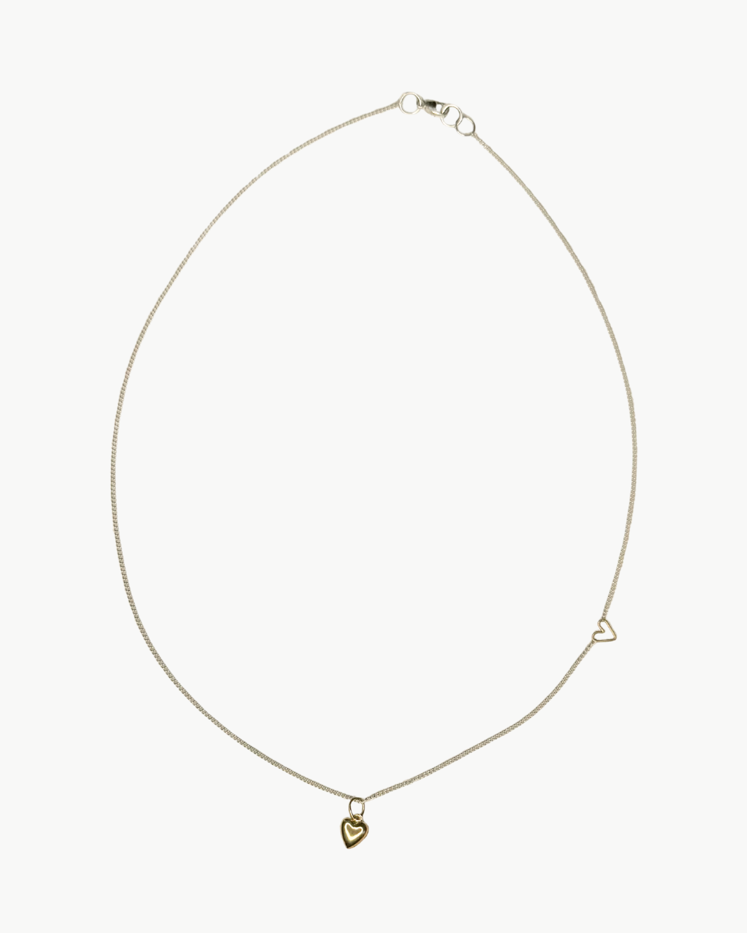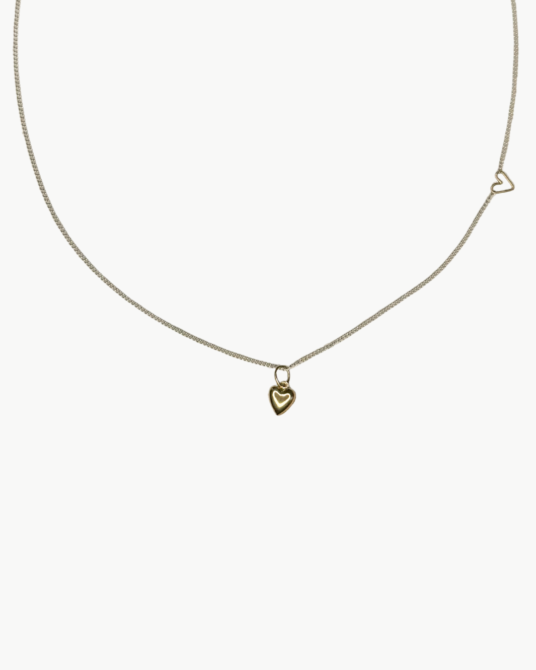 Delicate with a subtle twist, the Tiny Puff Heart Necklace in two-tone blends everyday ease with thoughtful detail. A fine sterling silver chain anchors a softly rounded 14k gold puff heart, accented by a tiny gold heart along the side for an unexpected, personal touch. Effortless worn solo and ideal for layering, this piece adds quiet charm to any jewelry lineup.