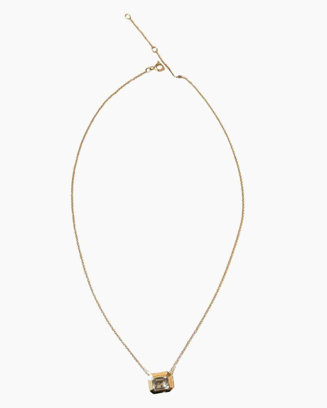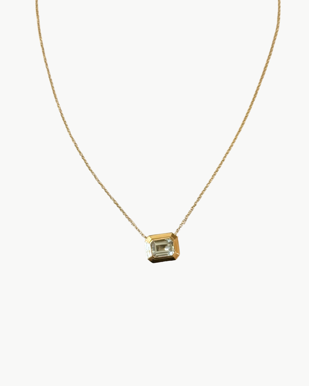 A refined fine-jewelry necklace crafted in polished gold, showcasing a rectangular green amethyst suspended from a delicate chain. The gemstone is set in a clean, architectural bezel that highlights its soft green hue while giving the piece a modern, sculptural presence. Minimal yet striking, this necklace is designed to sit close to the neckline for an understated, elevated finish.