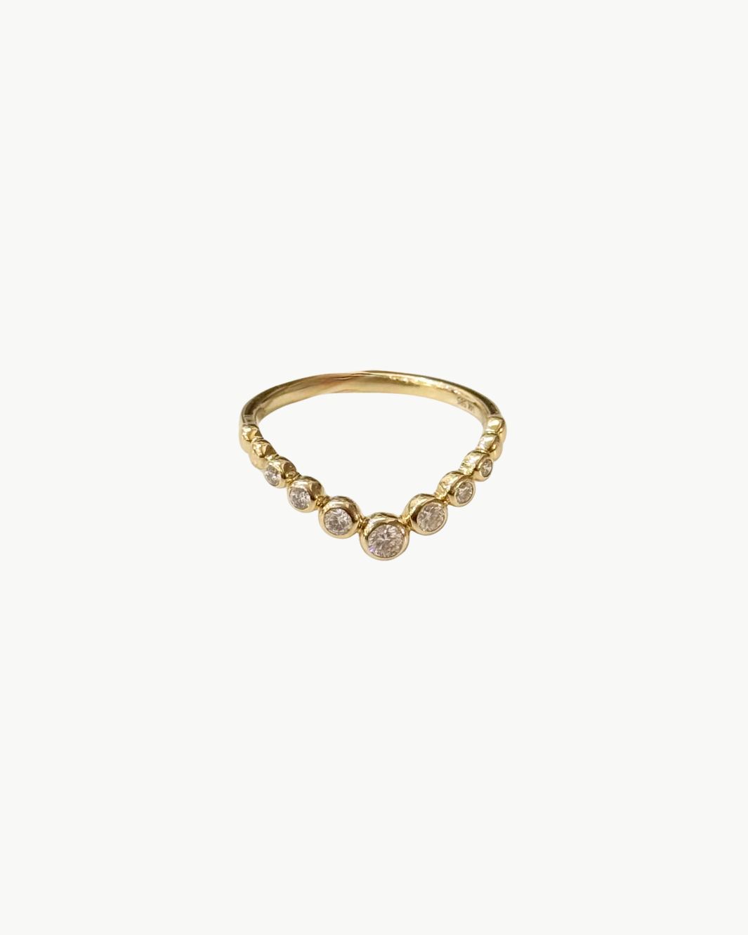A quietly luxurious essential, this curvy diamond band is crafted in luminous 14k gold and designed with a softly contoured silhouette that follows the natural line of the finger. Delicately set diamonds add a subtle brilliance, offering an understated glow that feels both timeless and modern. Elegant worn solo or layered effortlessly into a stacked look, this piece is a refined expression of everyday fine jewelry.