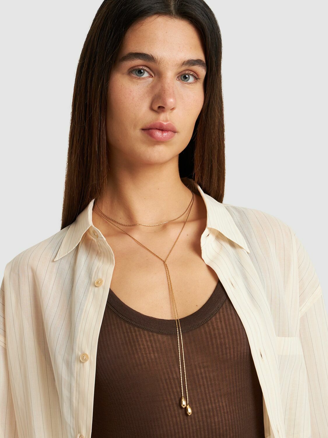 This long necklace delivers effortless impact with a clean, elongated silhouette designed to layer beautifully or stand on its own. Crafted in smooth brass, it features a fluid drape and a refined clasp closure that keeps the look minimal and modern. Understated yet striking, it’s an easy finishing touch for everyday or elevated styling.
