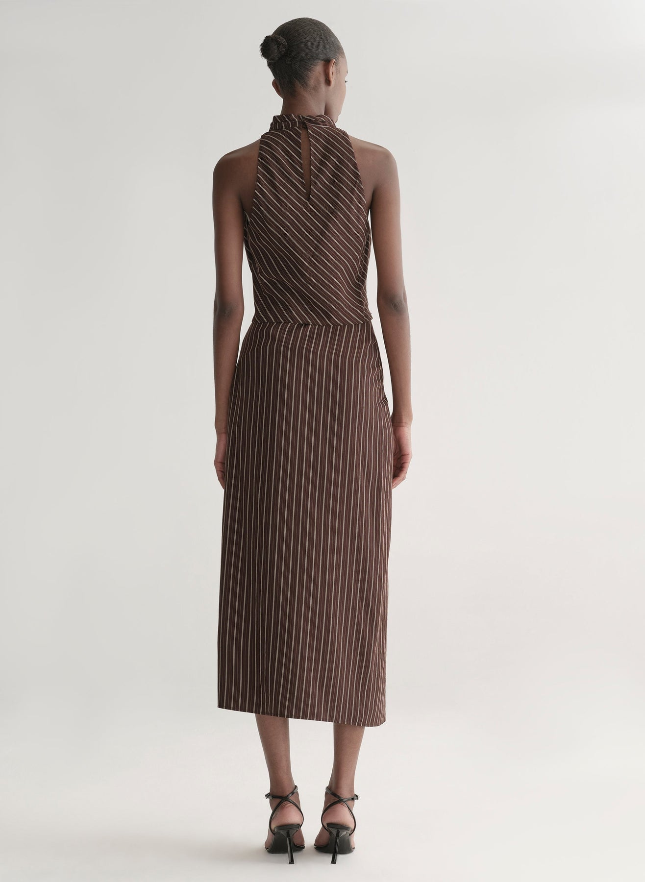 Crafted from fluid barre-stripe shirting in a rich ganache palette, the Jean Skirt drapes beautifully in a midi column silhouette. Asymmetric gathering at the hip creates sculpted, directional lines that fall into a subtly uneven hem, giving the piece effortless movement and a refined, modern feel. Soft, easy, and architectural, it sits cleanly at the natural waist for a flattering and versatile finish.