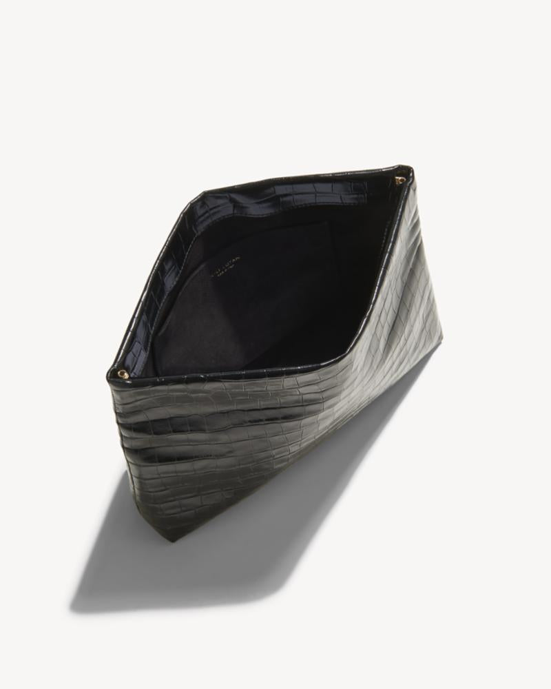 The Jerry Clutch is a refined statement piece, expertly crafted from Italian embossed croc-stamped calfskin. Its structured base allows it to stand upright or be elegantly folded over, while the Italian suede lining adds a luxurious touch. With a discreet interior pocket and debossed NILI LOTAN NEW YORK logo, this versatile clutch blends sleek sophistication with practical functionality.