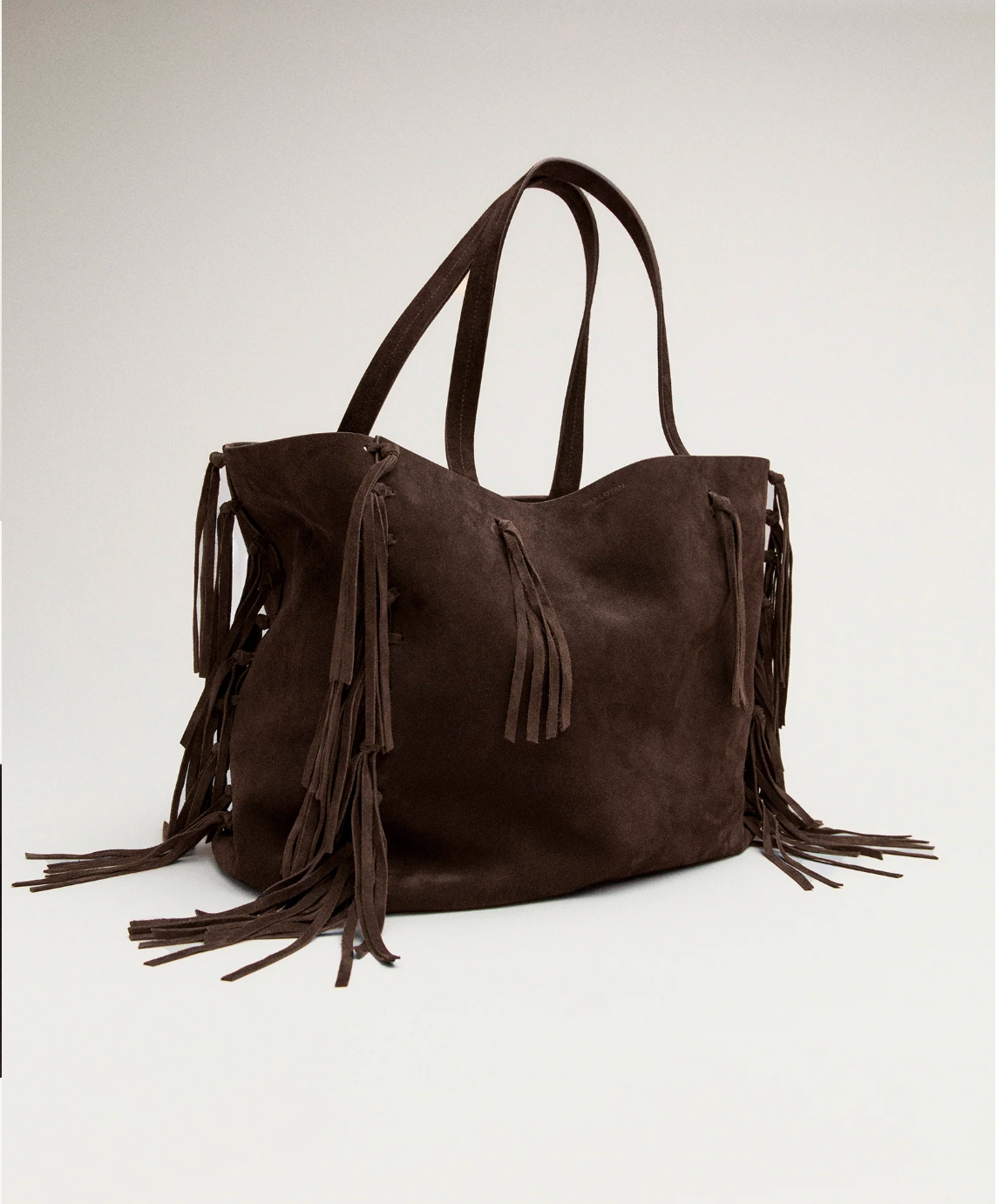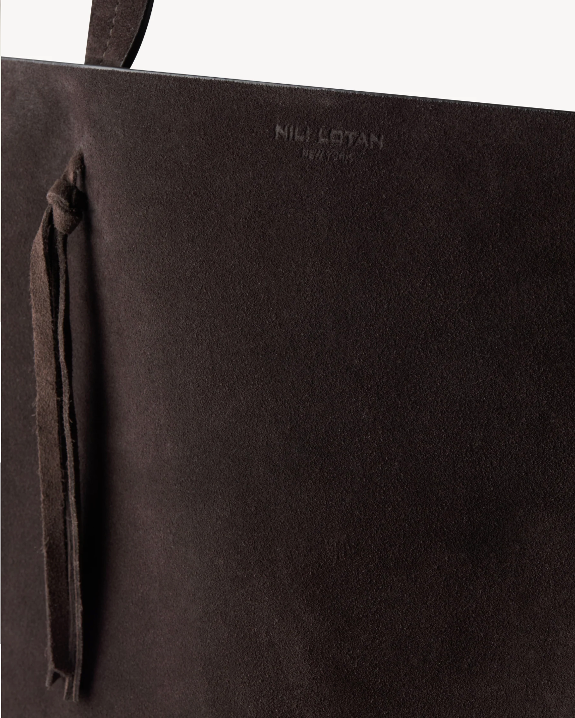 The Joni Bag is a luxurious Italian suede shoulder bag featuring a soft, collapsible silhouette and signature hand-knotted fringe detailing with over 40 individual leather laces. Expertly crafted in Italy, it offers a back wall zip pocket, interior logo zipper puller, and subtle debossed NILI LOTAN NEW YORK branding, combining artisanal elegance with practical organization.