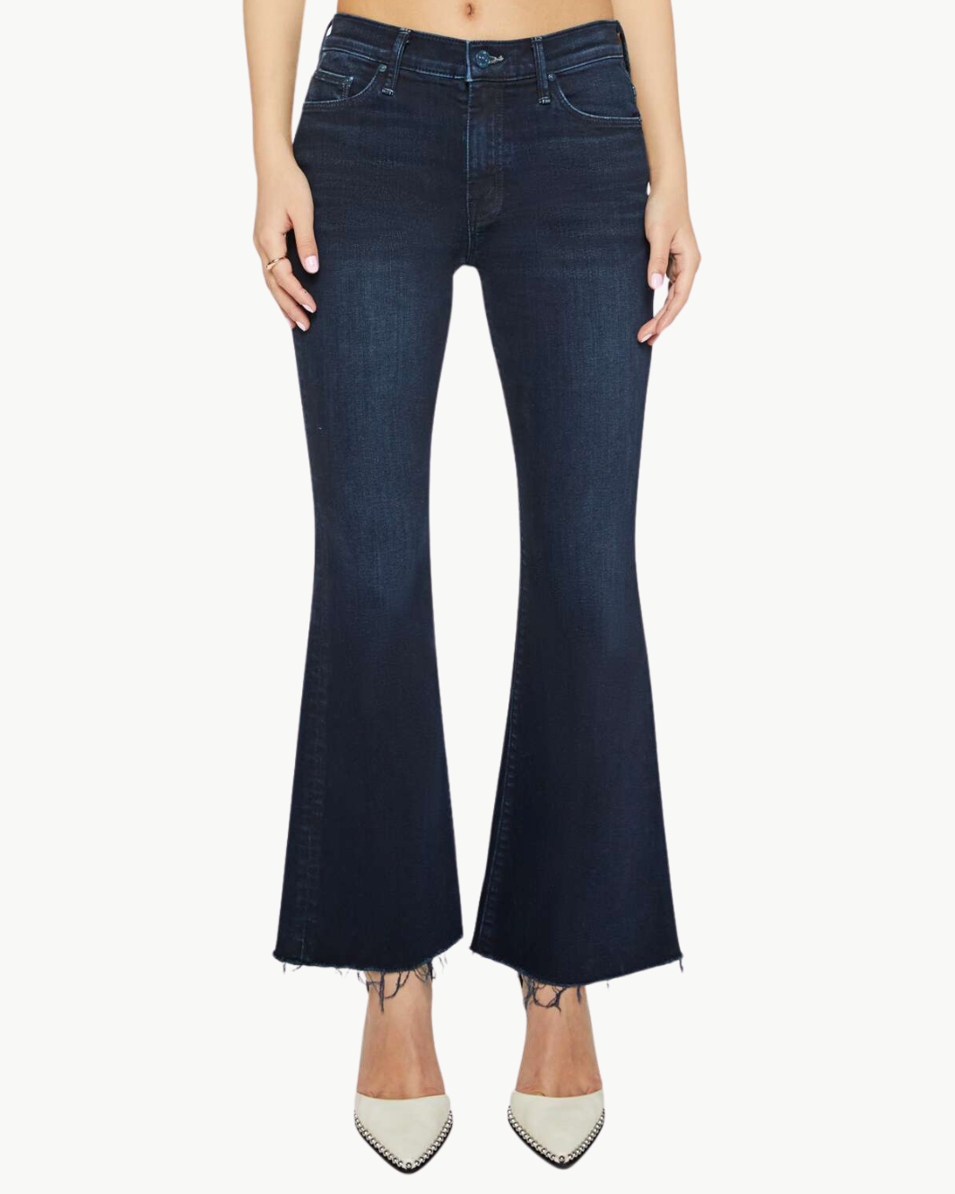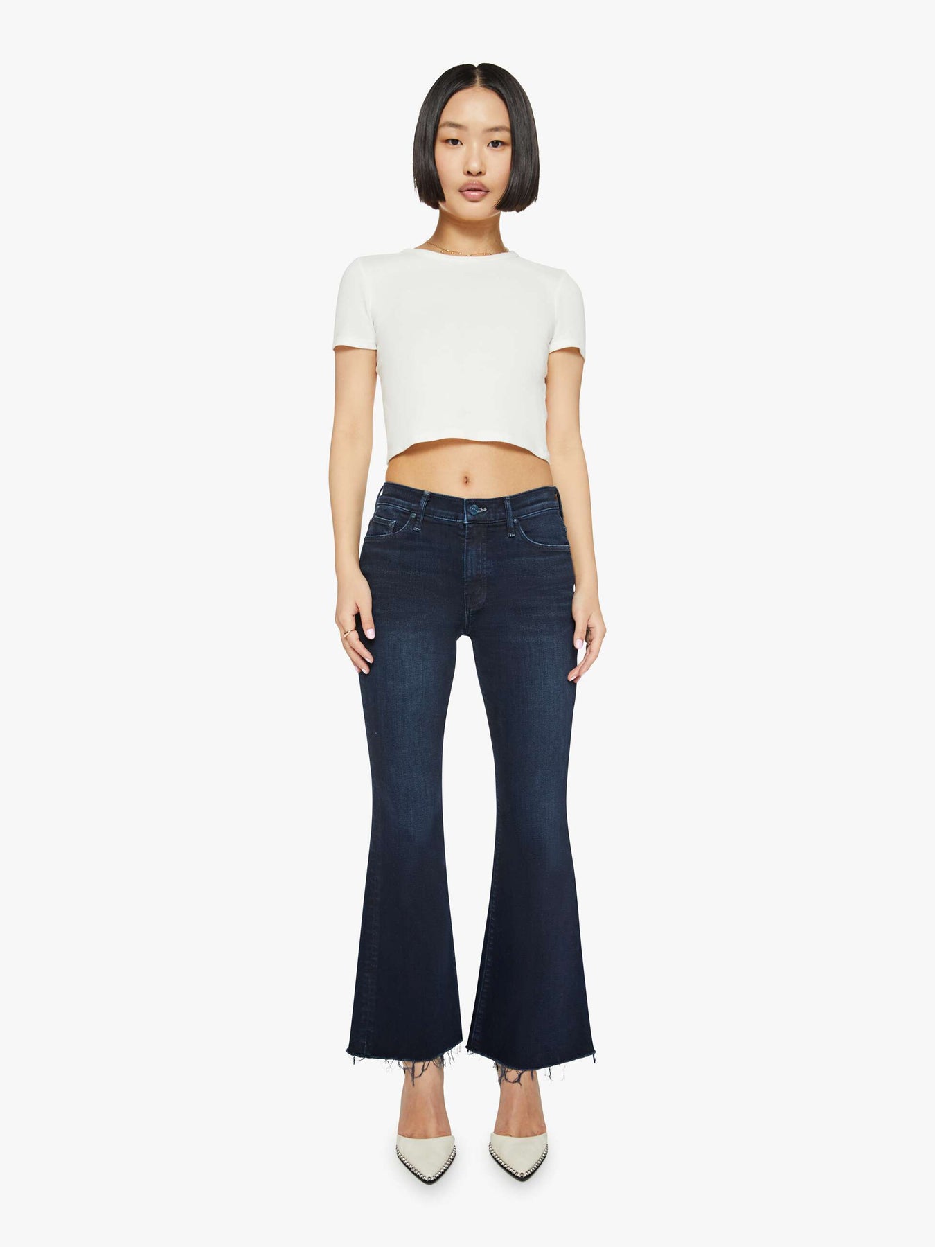 Good things come in small packages. From MOTHER’s LIL' MOTHER collection, this petite-friendly version of their most popular mid-rise flare is specially proportioned for bodies 5’4” and under, with a higher knee placement, shorter inseam, and rise for a flawless fit. Cut from stretch denim in a dark blue wash called Chip On My Shoulder, it features super subtle fading and whiskering and finishes with a frayed hem.