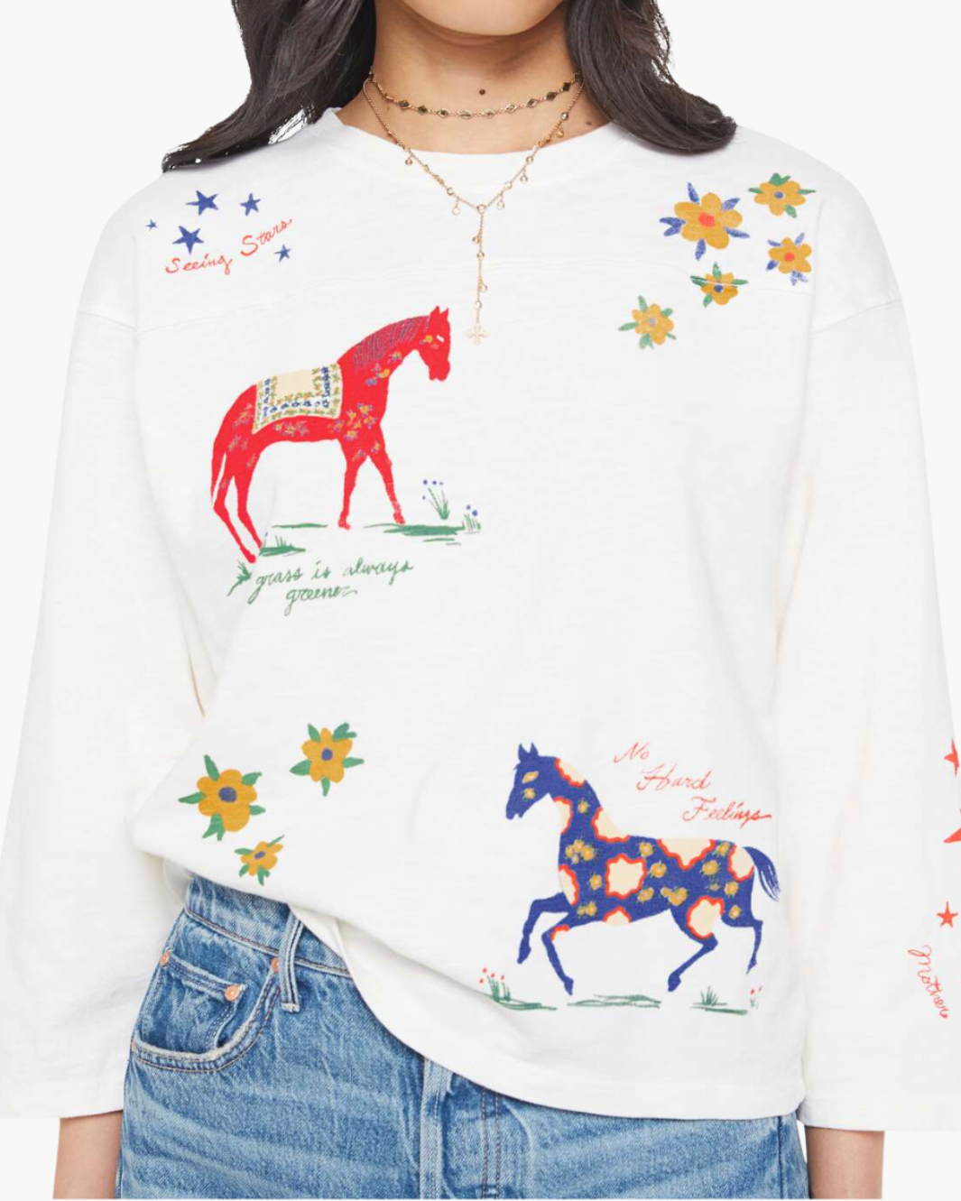 Let your style roam freely in this oversized, football-inspired tee that blends laid-back ease with playful personality. Designed with drop shoulders, 3/4 sleeves, and a roomy boxy fit, it delivers that effortless, lived-in feel. The cotton-linen blend adds natural breathability, while the allover horse and floral graphics bring a whimsical touch. Finished with bold text across the back for a standout finish.