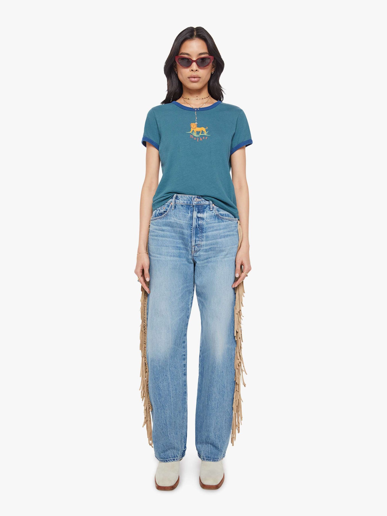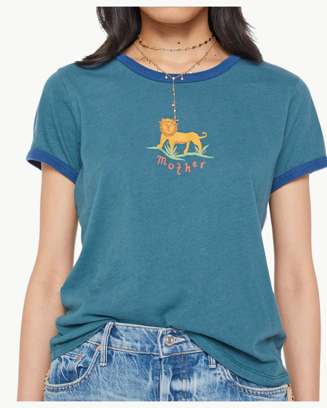 Bring bold personality to your everyday lineup with The Lil Goodie Ringer. This crewneck tee features extra-short sleeves and a slightly shrunken fit, crafted in a deep green hue with contrast navy trim. A hand-drawn lion graphic and bright orange MOTHER lettering add a playful, standout finish.