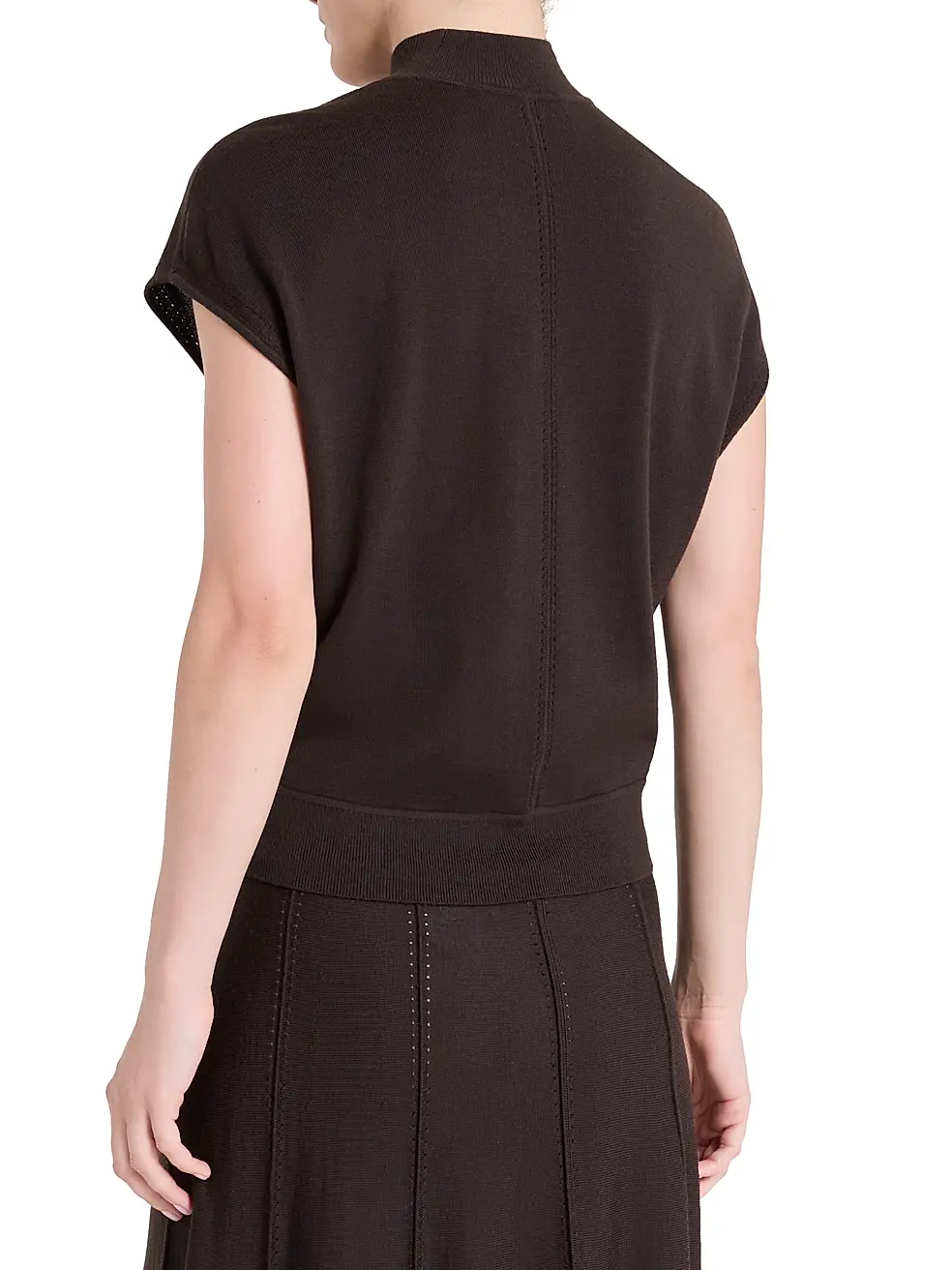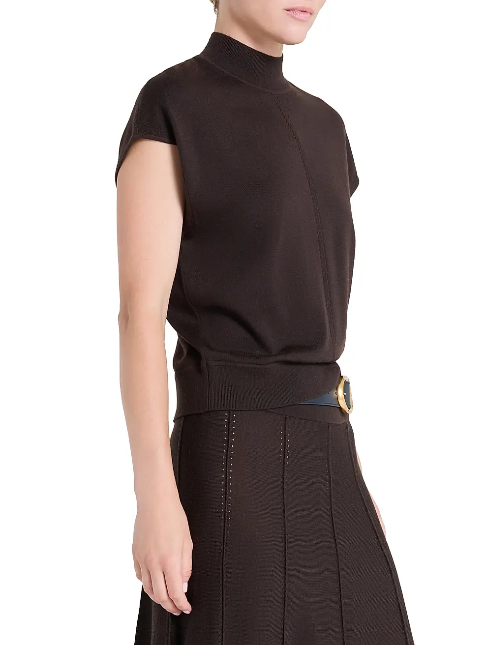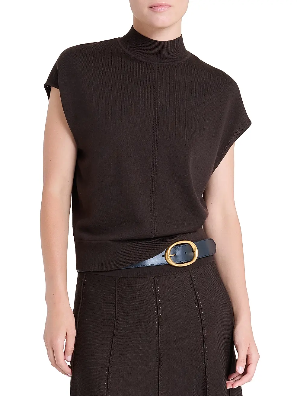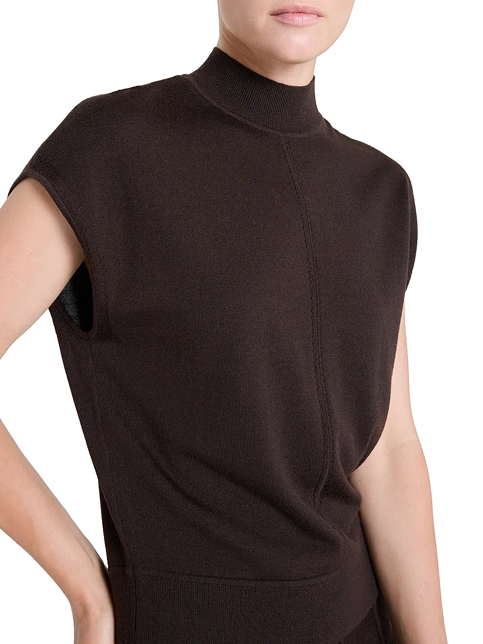 The Wren Top from TWP is a modern essential defined by its slouchy mock turtleneck and relaxed, sculptural shape. Designed with cap sleeves, top-stitch detailing, and a center seam, it blends minimalist structure with effortless ease.