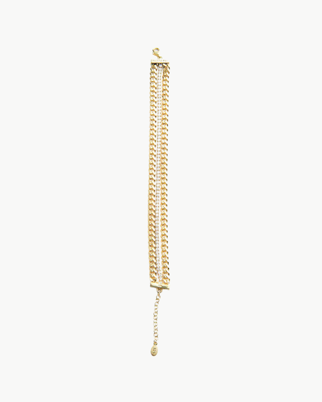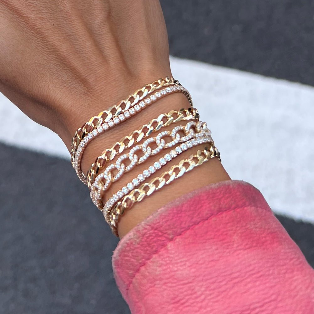A fresh take on everyday shine, this bracelet pairs a sleek small Cuban-link chain with a row of clear crystals for the perfect balance of edge and elegance. Crafted in warm 14k gold vermeil, it layers beautifully—especially with the Vasy and Anastasia bracelets—yet stands out effortlessly on its own.