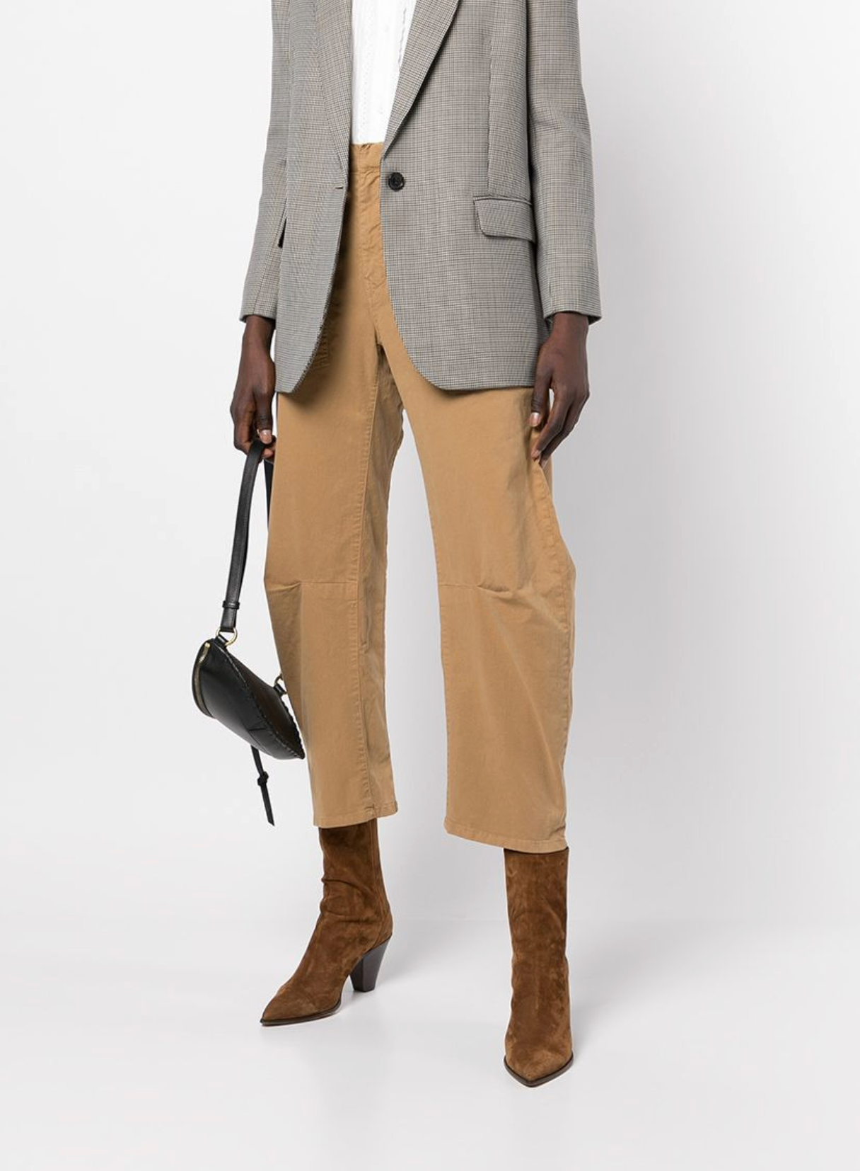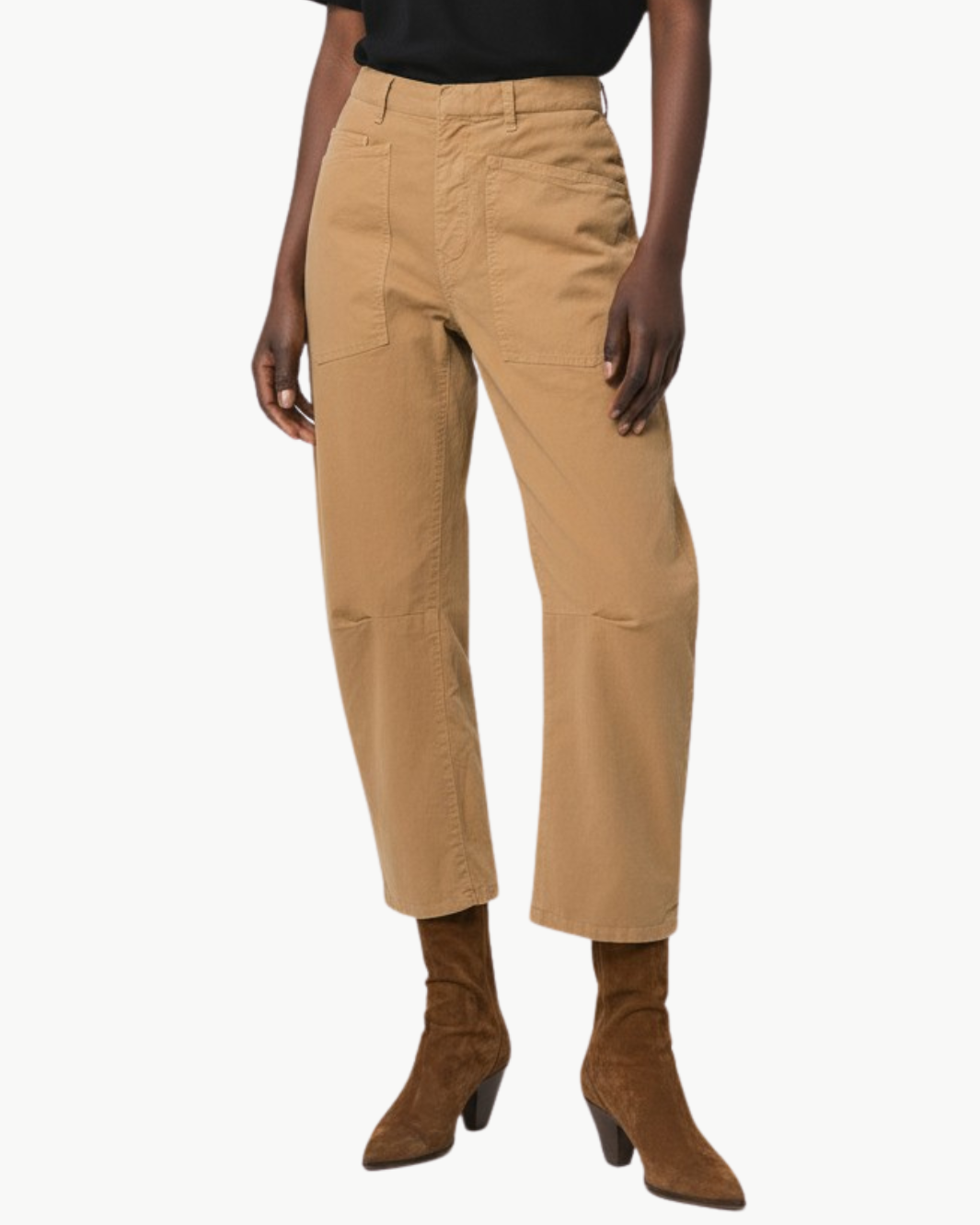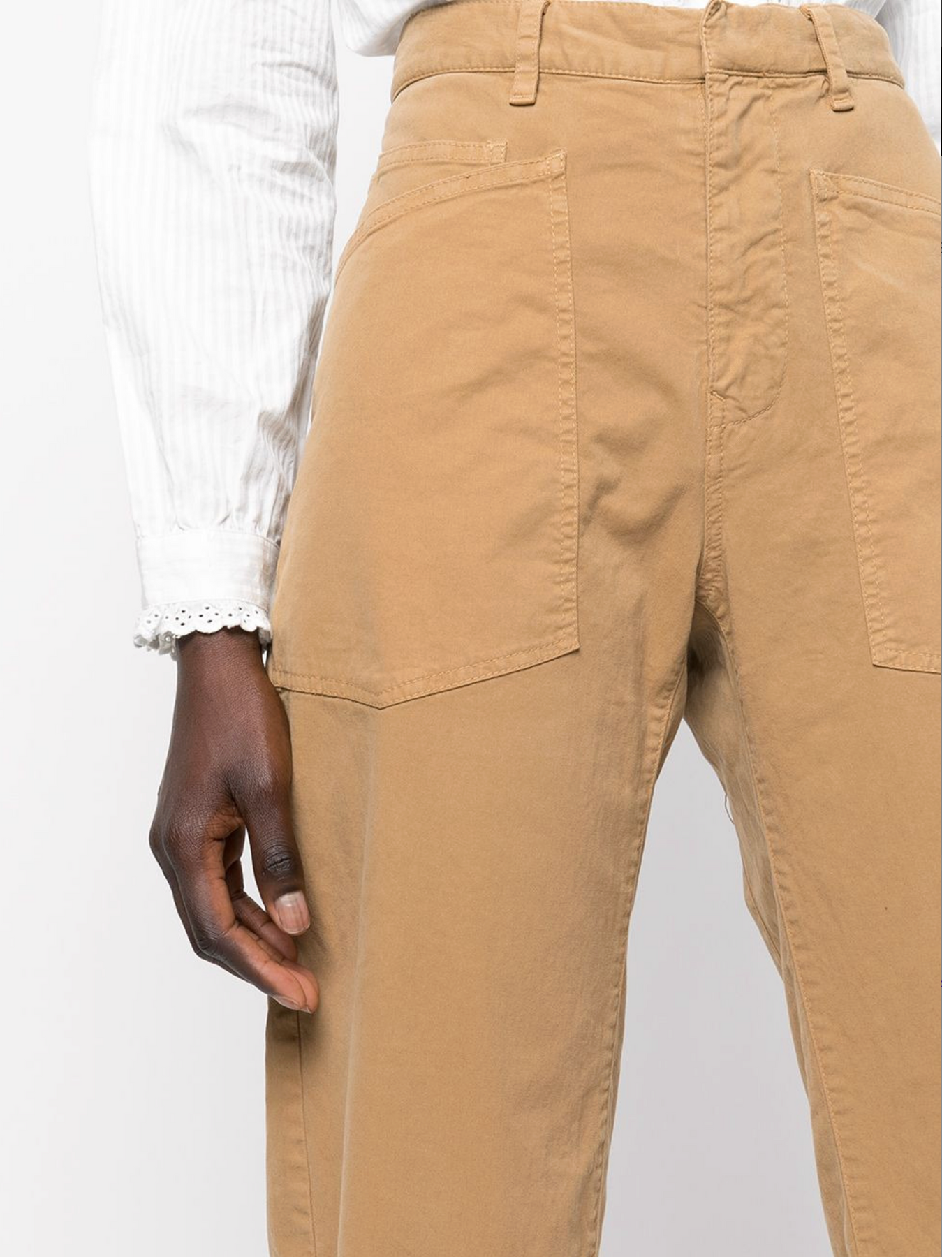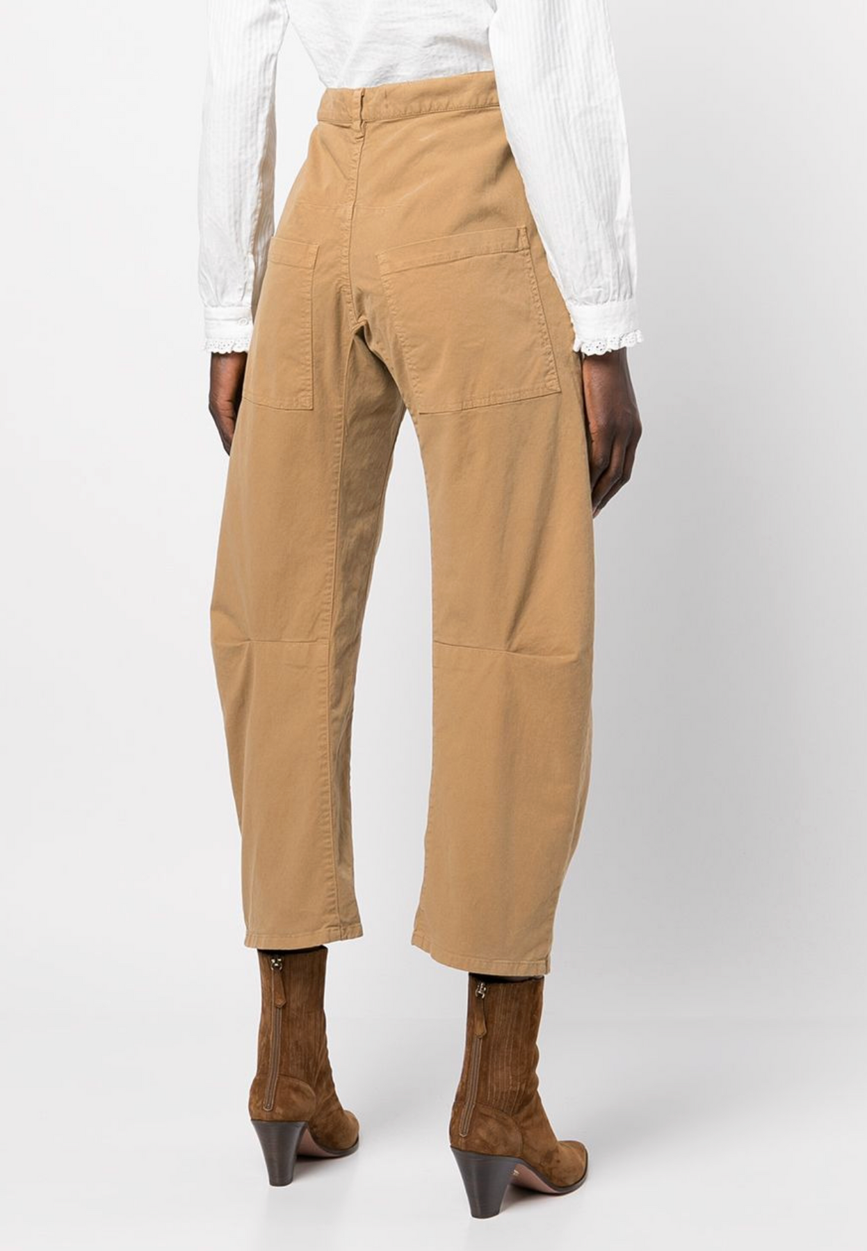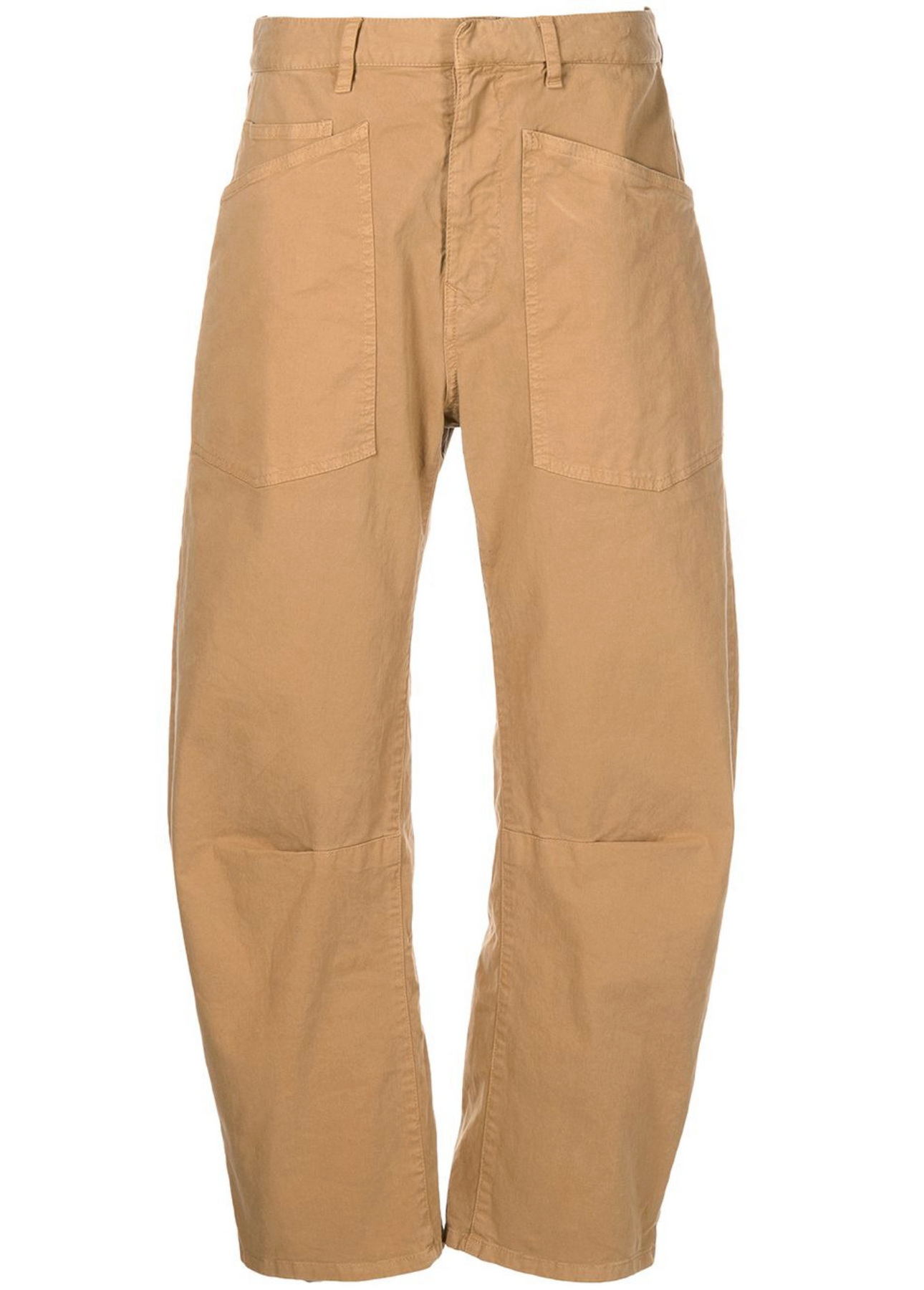 Flat front, mid-rise relaxed fit pant in non-stretch cotton from Nili Lotan. Uniquely curved silhouette. Easy gently tapered legs. Seam detail at knees. Gusset at inseam. Zip fly with hidden hook and bar closure. Hidden button closure. Top-stitched front and back patch pockets. Belt loops.