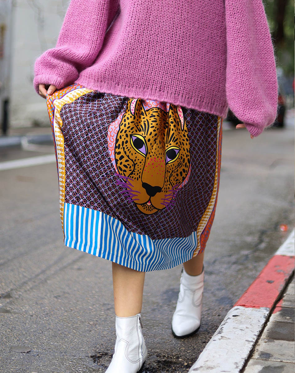 Bold yet effortlessly wearable, the Hailey Printed Skirt is crafted from smooth viscose satin that drapes fluidly with every step. Designed to feel lightweight and polished, this standout style features a striking jaguar-inspired graphic print that brings energy and personality to the silhouette. The midi length adds versatility, making it easy to dress up or down while maintaining a relaxed, statement-making feel.