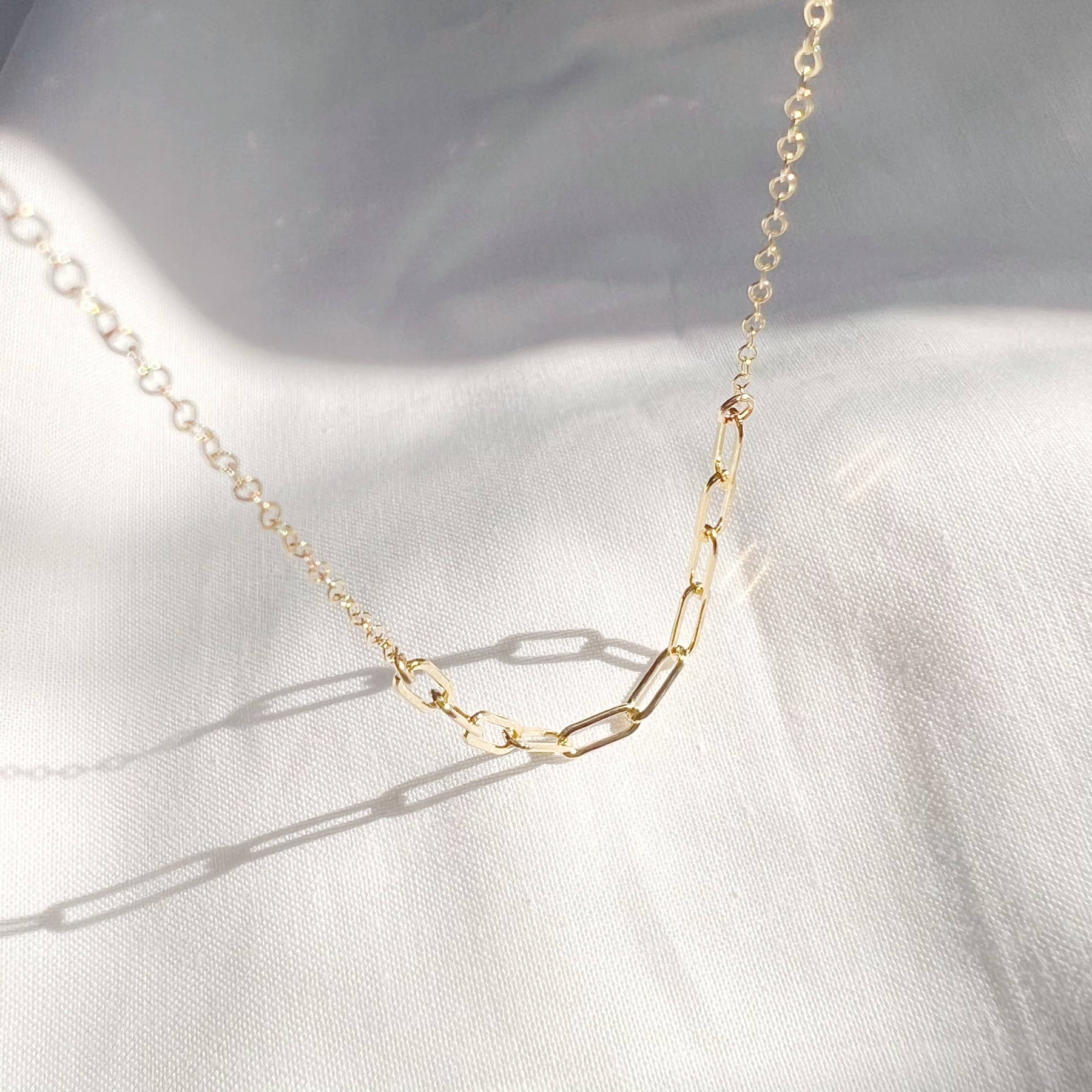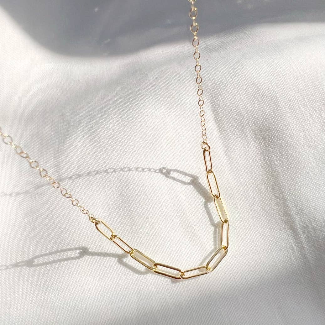 A modern layering essential with effortless shine. The Golden Hour Paperclip Necklace combines 14/20 gold-filled paperclip links with a dainty signature cable chain for a sleek, mixed-texture look. Adjustable and beautifully handcrafted, it’s the easy, everyday piece that elevates any neckline.
