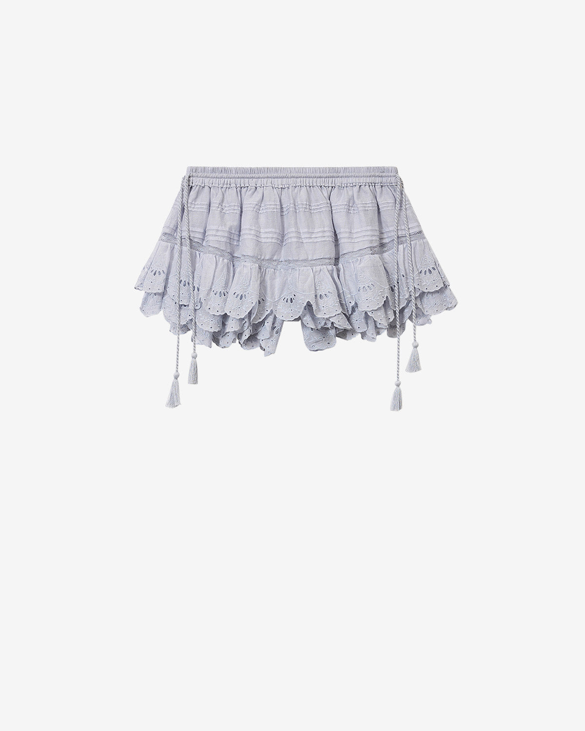The Puria Skort blends feminine detail with an easy, playful silhouette. Designed with a skater-style cut, it features delicate pintucks and broderie anglaise that add texture and charm throughout. Adjustable tie strings with pompom accents at the waist lend a relaxed, artisanal touch, making this piece feel both lighthearted and refined.