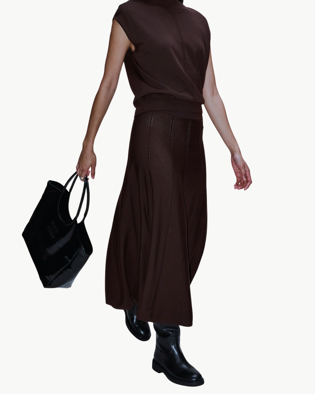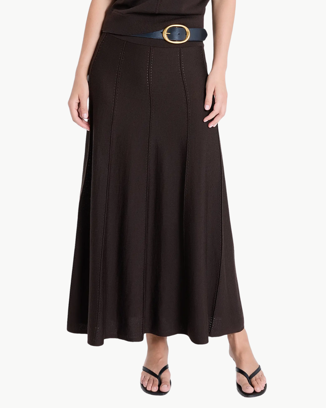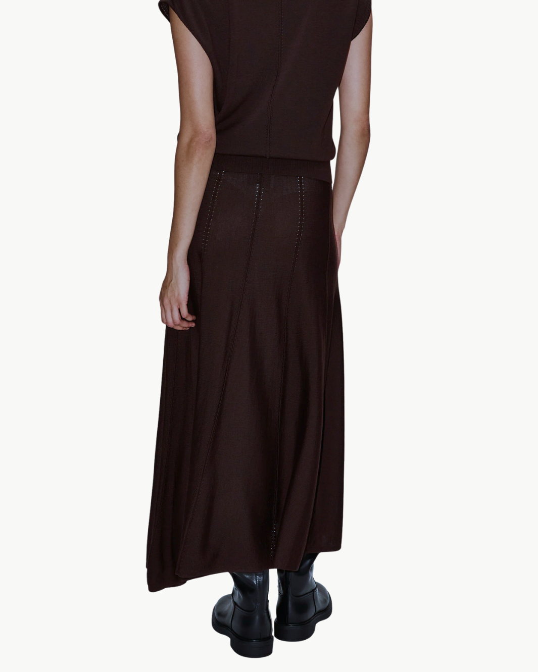The Willow Wool Maxi Skirt brings refined movement and modern structure together through its seamed panels and contrast stitching. Its clean, elongated shape creates a sleek silhouette that flows effortlessly, making it a polished essential with subtle architectural edge.