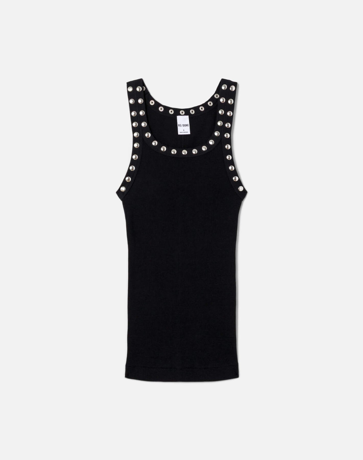 The RE/DONE Ribbed Tank reimagines the classic men’s undershirt as a modern wardrobe staple. Crafted from soft, 100% cotton rib, it’s cut with balanced straps and a body-hugging fit that flatters while staying effortlessly comfortable. Finished with nickel studs along the neckline, this updated take adds subtle shine and edge—perfect for standing on its own or layering.