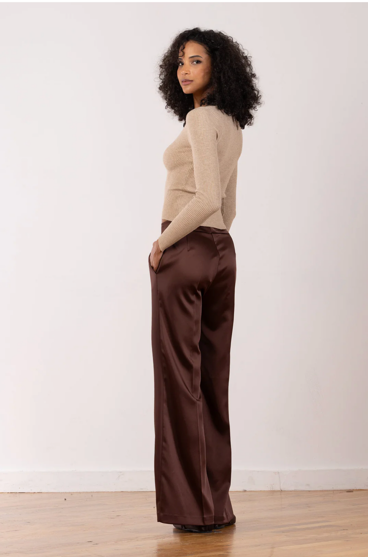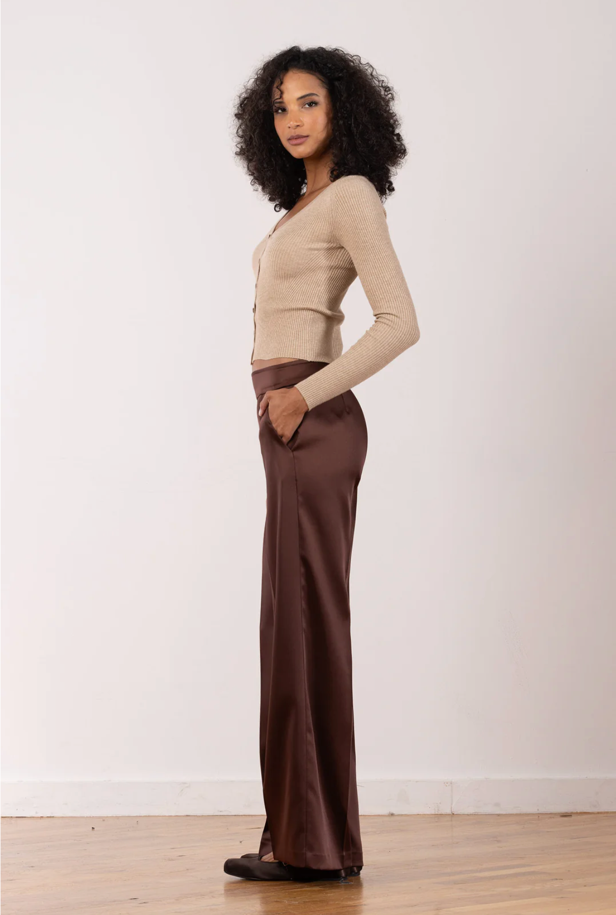 The Carla style is a full-length palazzo-style pant with pockets. Palazzo pants are supremely comfortable because of their wonderfully loose cut, which allows the legs to swirl around you as you walk and gives a graceful flare to your figure.