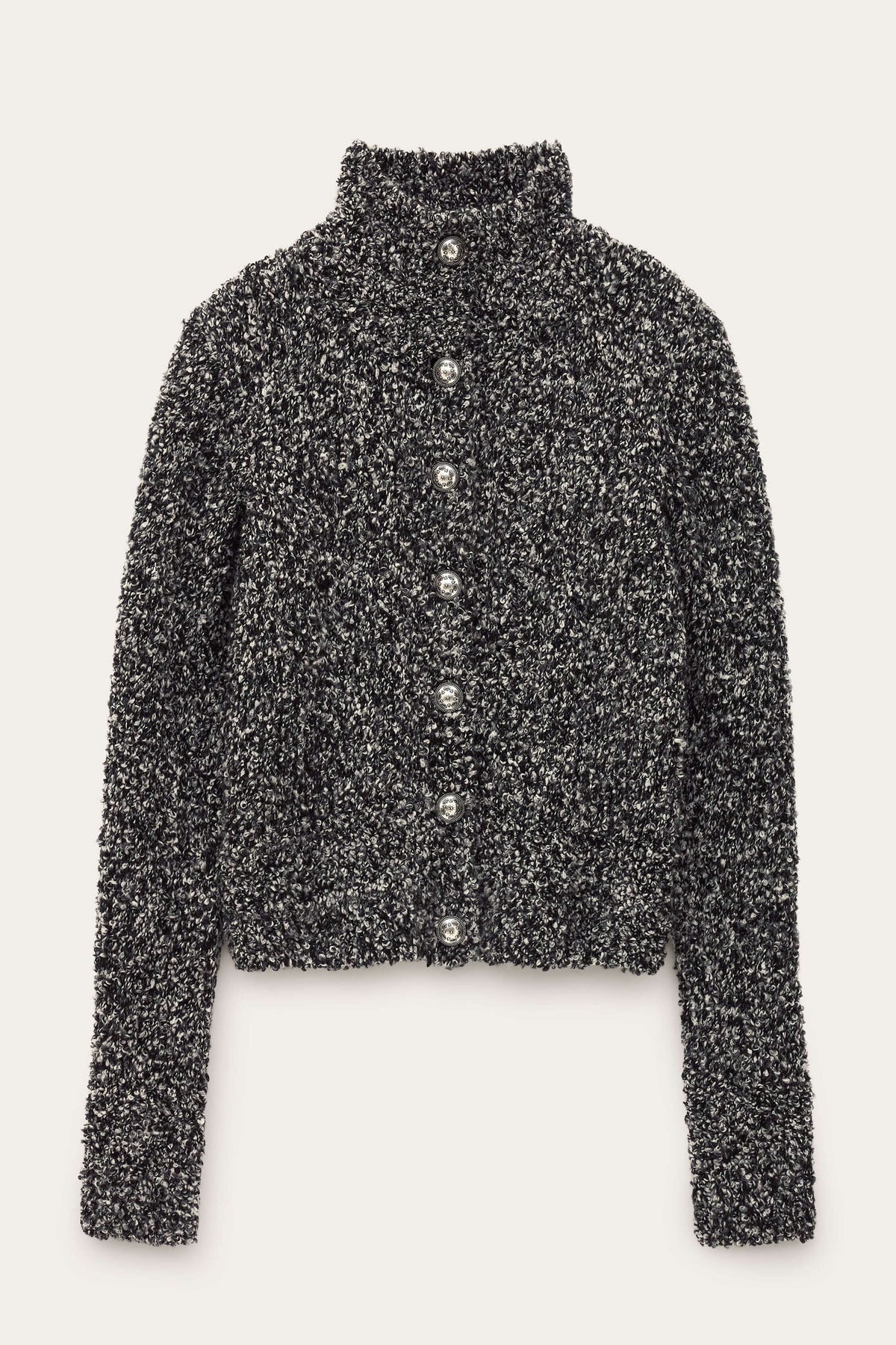 The Carla Cardigan in Anthracite from ba&sh brings a timeless, polished touch to cool-weather dressing. Its soft wool-blend knit offers warmth without bulk, while the classic crew neck and streamlined silhouette make it endlessly versatile. Perfect layered over a blouse or worn solo for a refined, understated look.