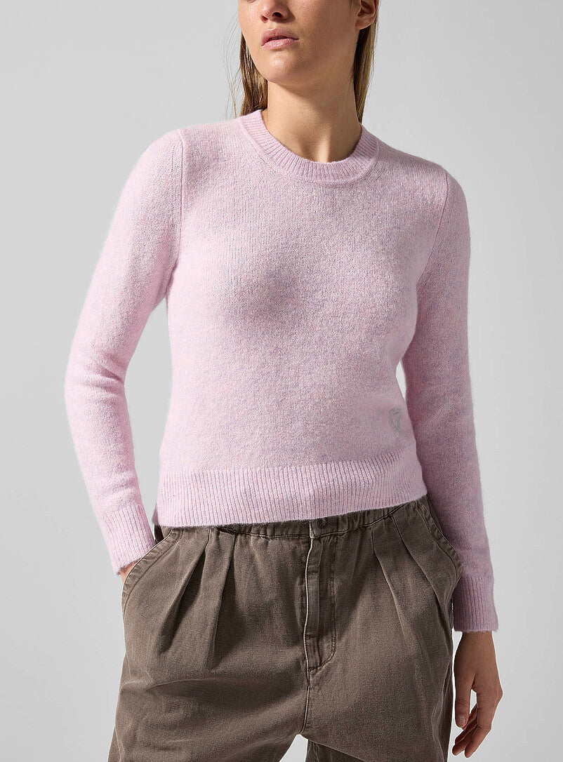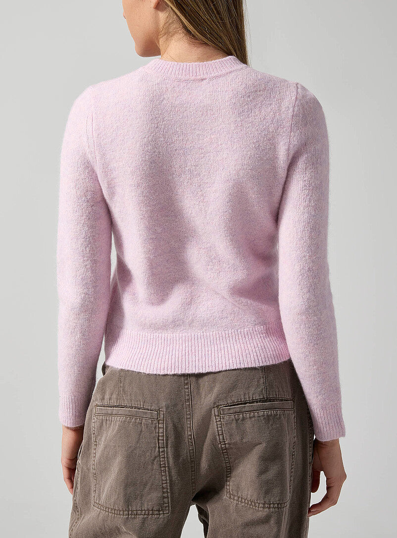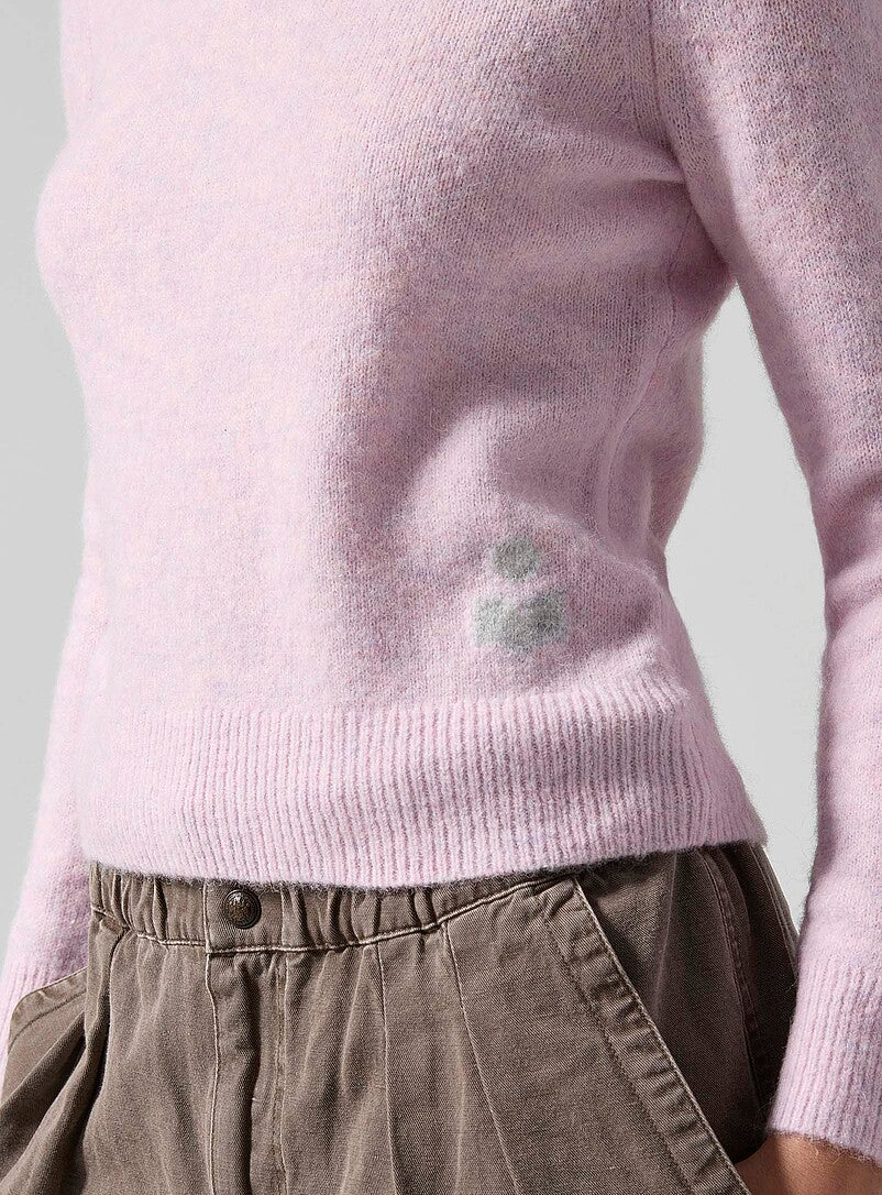 The Isadora Pullover is a soft, feminine knit that balances cozy texture with a clean, fitted silhouette. Crafted from a young alpaca wool blend, this sweater feels plush yet lightweight, with a subtle pastel mauve tone that adds an understated softness to everyday dressing. Finished with ribbed edging and Isabel Marant’s logo detail at the side, it’s an effortless piece that feels both polished and relaxed—perfect worn alone or layered through the seasons.